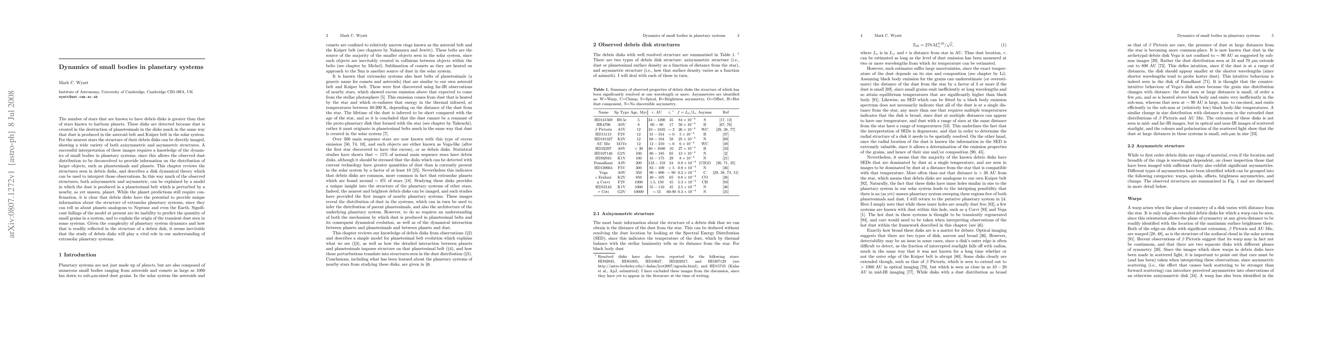 This paper reviews the dynamics of small bodies in planetary systems, focusing on debris disks around stars. It discusses how debris disks' structures, both symmetric and asymmetric, can reveal information about unseen planets, suggesting that these disks hold unique insights into the architecture of extrasolar planetary systems.