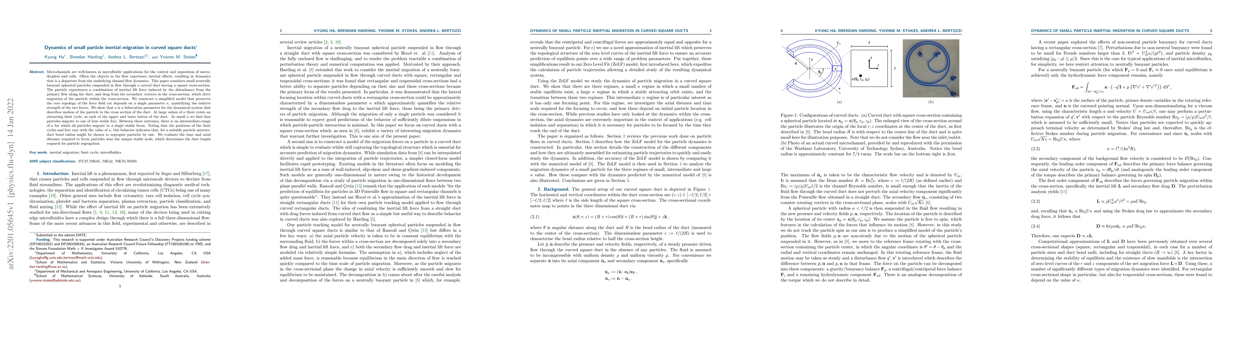 Research shows that small neutrally buoyant particles can migrate in curved ducts with a square cross-section, influenced by inertial lift force and drag from secondary vortices. The movement of particles depends on a single parameter, kappa, which determines whether they focus at stable nodes or follow limit cycles.