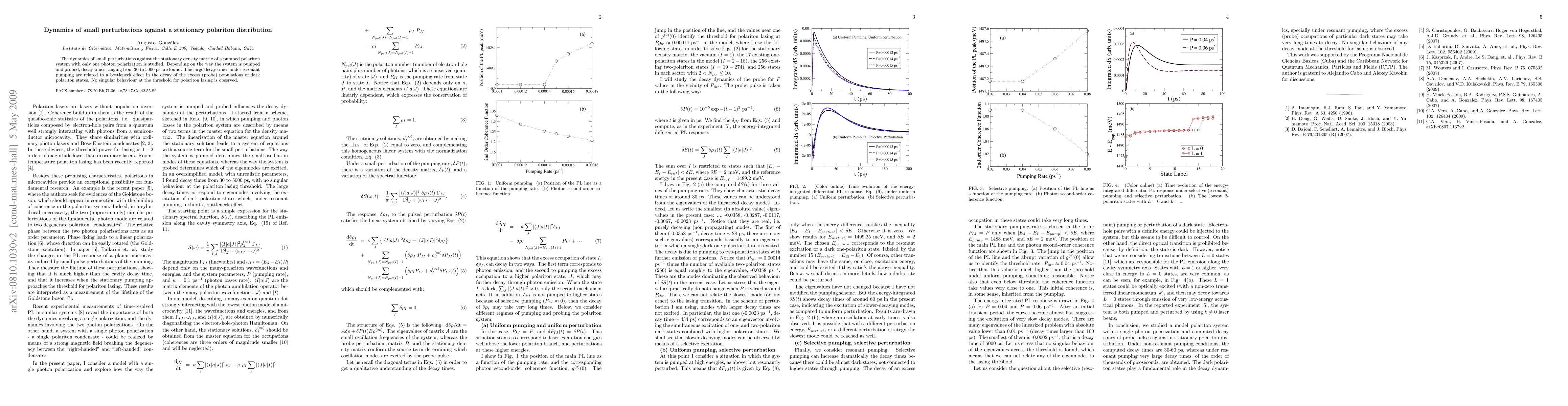The dynamics of small perturbations against the stationary density matrix of a pumped polariton system with only one photon polarization is studied. Depending on the way the system is pumped and probed, decay times ranging from 30 to 5000 ps are found. The large decay times under resonant pumping are related to a bottleneck effect in the decay of the excess (probe) populations of dark polariton states. No singular behaviour at the threshold for polariton lasing is observed.