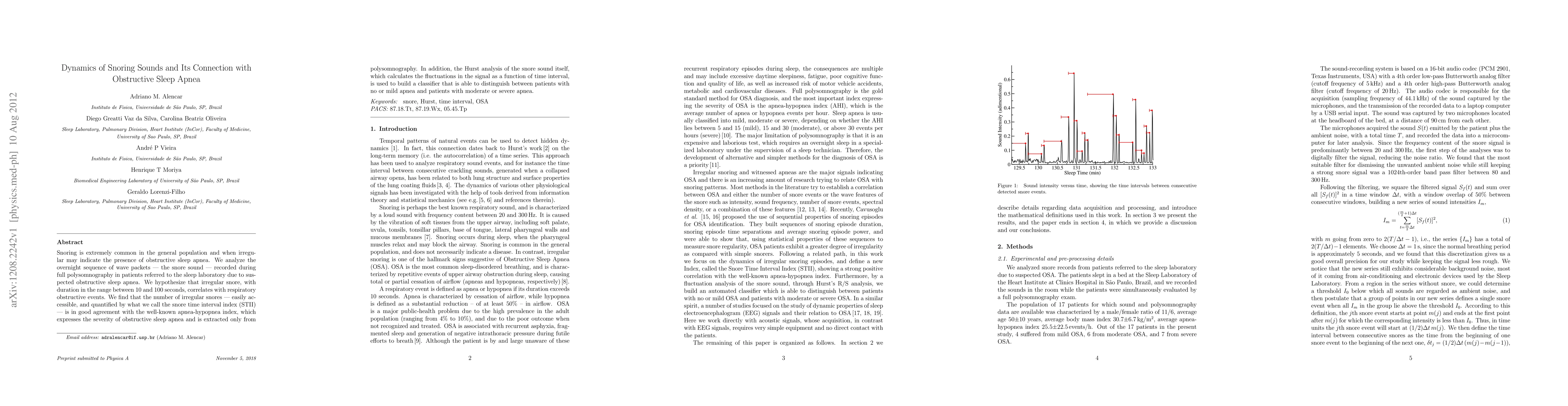 This study examines the relationship between the dynamics of snoring sounds and obstructive sleep apnea, finding that irregular snore duration correlates with the severity of apnea. The snore time interval index (STII) and Hurst analysis of snore sounds show good agreement with the apnea-hypopnea index, providing a potential non-invasive diagnostic tool for sleep apnea severity.