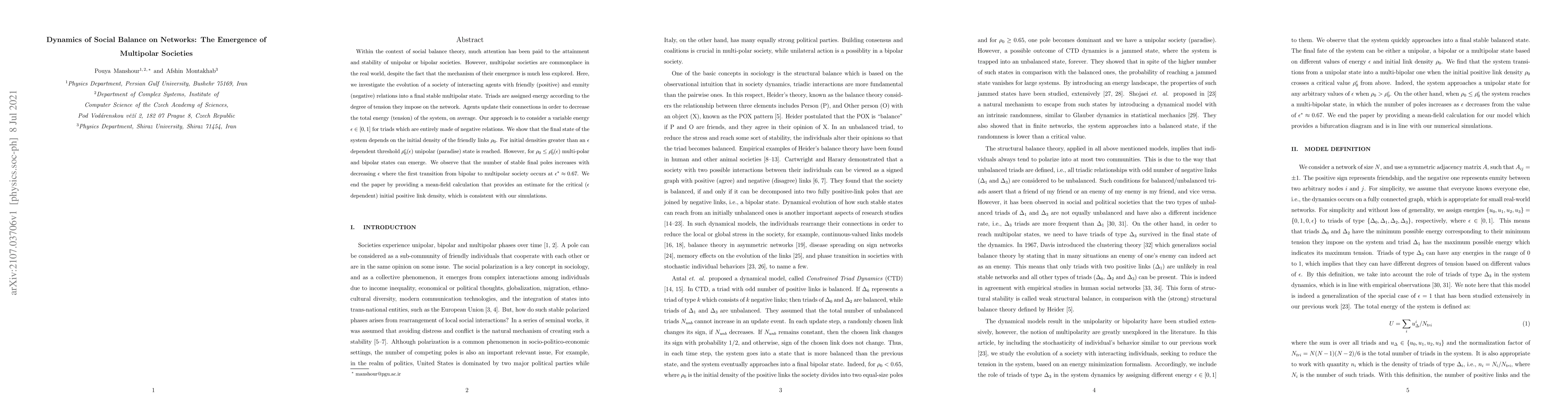 This research investigates the emergence of multipolar societies within social balance theory, which typically focuses on unipolar or bipolar states. The study models a society of agents with positive and negative relations, assigning energy to triads based on the relations. The system evolves to decrease average energy or tension. Key findings reveal that the final state depends on initial friendly link density $ ho_0$. For $ ho_0$ above a certain threshold, a unipolar state is reached; below this, multipolar and bipolar states can form. The number of stable poles increases as $epsilon$ (energy for all-negative triads) decreases, with a transition from bipolar to multipolar society occurring at $epsilon^*approx 0.67$. Mean-field calculations support these simulation results.