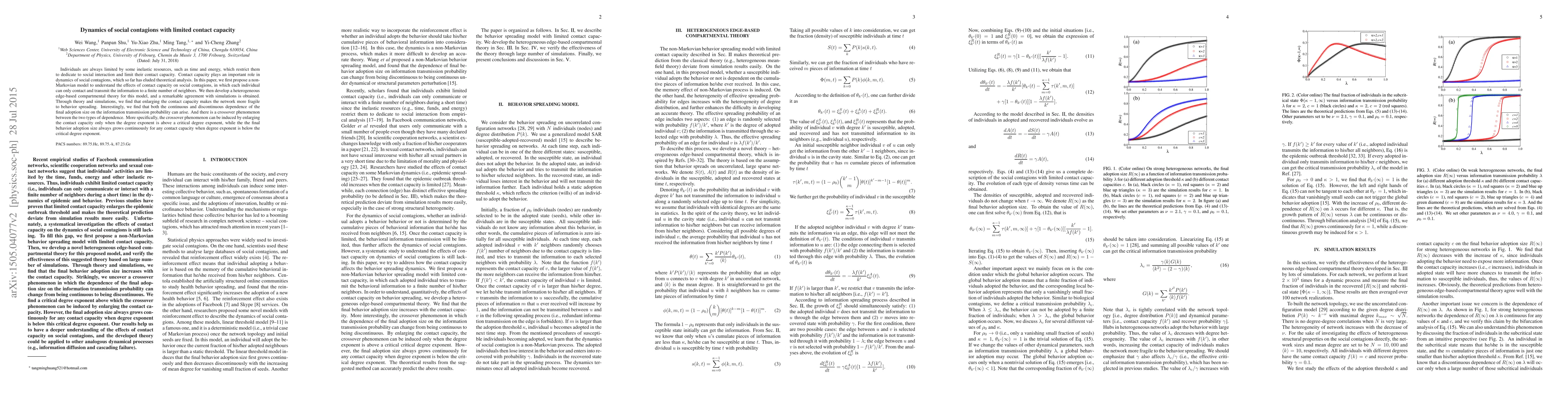 This paper proposes a non-Markovian model to study the impact of limited contact capacity on social contagions, finding that larger contact capacities can make networks more fragile to information spread. It also reveals a crossover phenomenon where the dependence on transmission probability changes with network degree distribution.