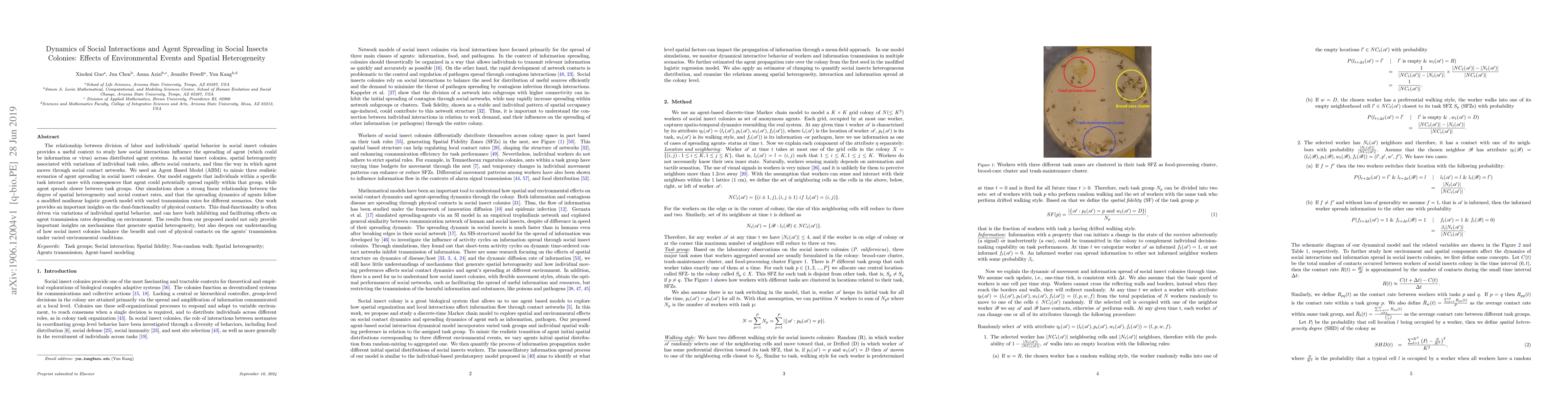 The relationship between division of labor and individuals' spatial behavior in social insect colonies provides a useful context to study how social interactions influence the spreading of agent (which could be information or virus) across distributed agent systems. In social insect colonies, spatial heterogeneity associated with variations of individual task roles, affects social contacts, and thus the way in which agent moves through social contact networks. We used an Agent Based Model (ABM) to mimic three realistic scenarios of agent spreading in social insect colonies. Our model suggests that individuals within a specific task interact more with consequences that agent could potentially spread rapidly within that group, while agent spreads slower between task groups. Our simulations show a strong linear relationship between the degree of spatial heterogeneity and social contact rates, and that the spreading dynamics of agents follow a modified nonlinear logistic growth model with varied transmission rates for different scenarios. Our work provides an important insights on the dual-functionality of physical contacts. This dual-functionality is often driven via variations of individual spatial behavior, and can have both inhibiting and facilitating effects on agent transmission rates depending on environment. The results from our proposed model not only provide important insights on mechanisms that generate spatial heterogeneity, but also deepen our understanding of how social insect colonies balance the benefit and cost of physical contacts on the agents' transmission under varied environmental conditions.