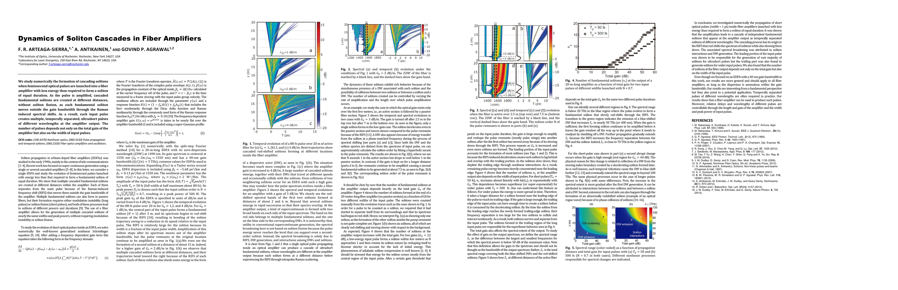 Researchers studied soliton cascades in fiber amplifiers when pulses have less energy than needed for a single soliton, creating multiple ultrashort pulses of different wavelengths at the amplifier output. The number of pulses depends on the total gain and width of input pulses.