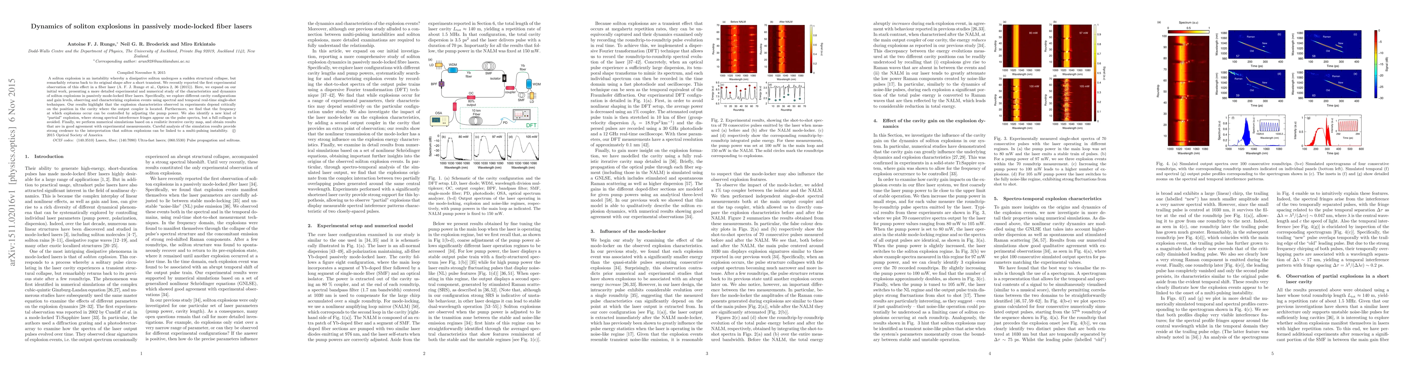 This research investigates the dynamics of soliton explosions in passively mode-locked fiber lasers, demonstrating that explosion characteristics depend on cavity configuration and pump power, while identifying a new "partial" explosion type. Numerical simulations align well with experimental findings, suggesting a multi-pulsing instability as a key factor.