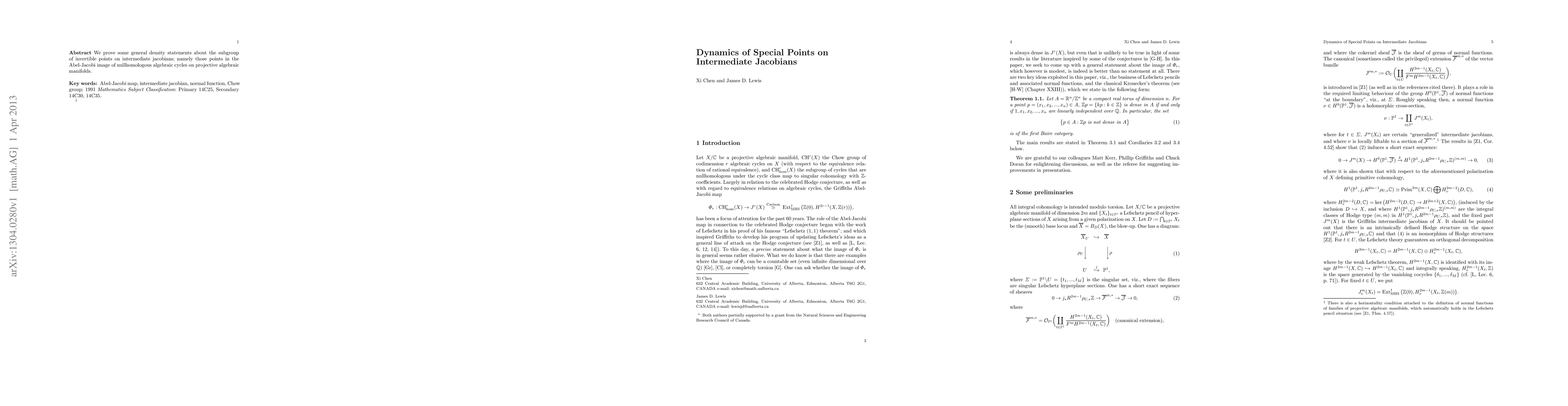 Summary: This paper proves general density statements regarding invertible points within the subgroup of intermediate Jacobians, specifically focusing on the Abel-Jacobi image of nullhomologous algebraic cycles on projective algebraic manifolds. The findings contribute to the understanding of the dynamics of special points on these Jacobians.