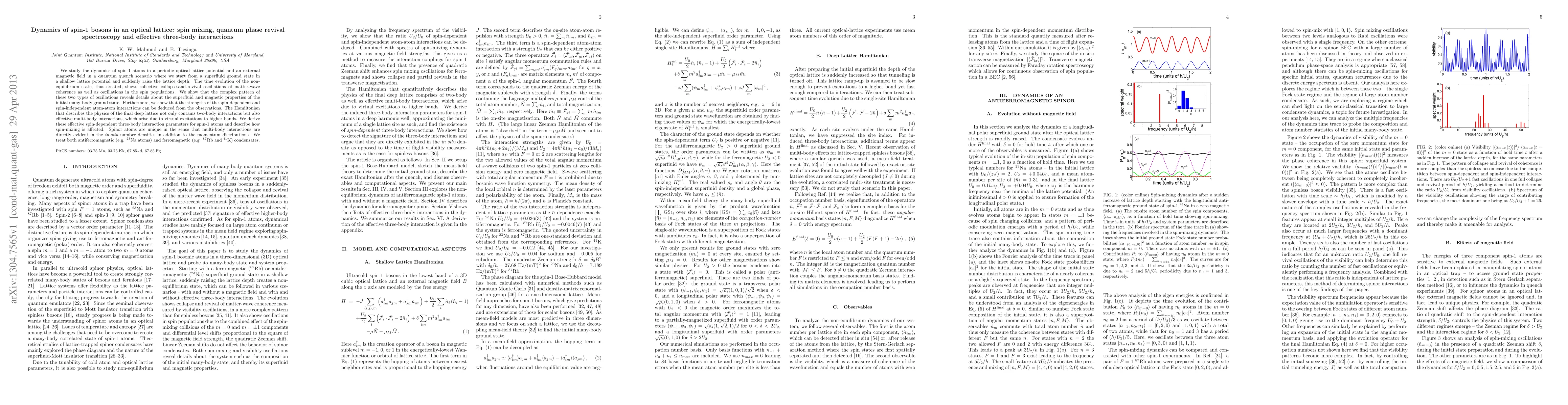 We study the dynamics of spin-1 atoms in a periodic optical-lattice potential and an external magnetic field in a quantum quench scenario where we start from a superfluid ground state in a shallow lattice potential and suddenly raise the lattice depth. The time evolution of the non-equilibrium state, thus created, shows collective collapse-and-revival oscillations of matter-wave coherence as well as oscillations in the spin populations. We show that the complex pattern of these two types of oscillations reveals details about the superfluid and magnetic properties of the initial many-body ground state. Furthermore, we show that the strengths of the spin-dependent and spin-independent atom-atom interactions can be deduced from the observations. The Hamiltonian that describes the physics of the final deep lattice not only contains two-body interactions but also effective multi-body interactions, which arise due to virtual excitations to higher bands. We derive these effective spin-dependent three-body interaction parameters for spin-1 atoms and describe how spin-mixing is affected. Spinor atoms are unique in the sense that multi-body interactions are directly evident in the in-situ number densities in addition to the momentum distributions. We treat both antiferromagnetic (e.g. $^{23}$Na atoms) and ferromagnetic (e.g. $^{87}$Rb and $^{41}$K) condensates.