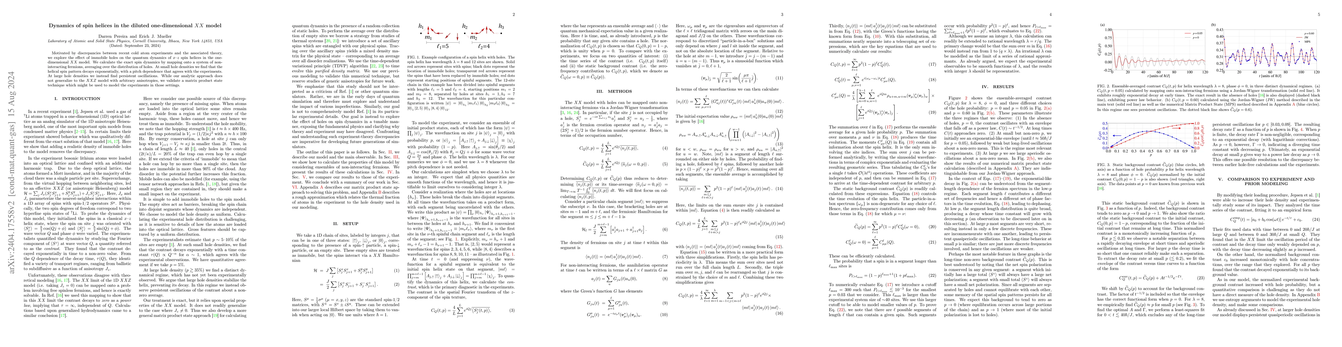 The study investigates the quantum dynamics of spin helices in a diluted one-dimensional $XX$ model, revealing that at low immobile hole densities, the spin helical pattern decays exponentially, while at high densities, persistent oscillations occur, aligning with recent cold atom experiments. A matrix product state technique is validated for future applications in similar anisotropic models.