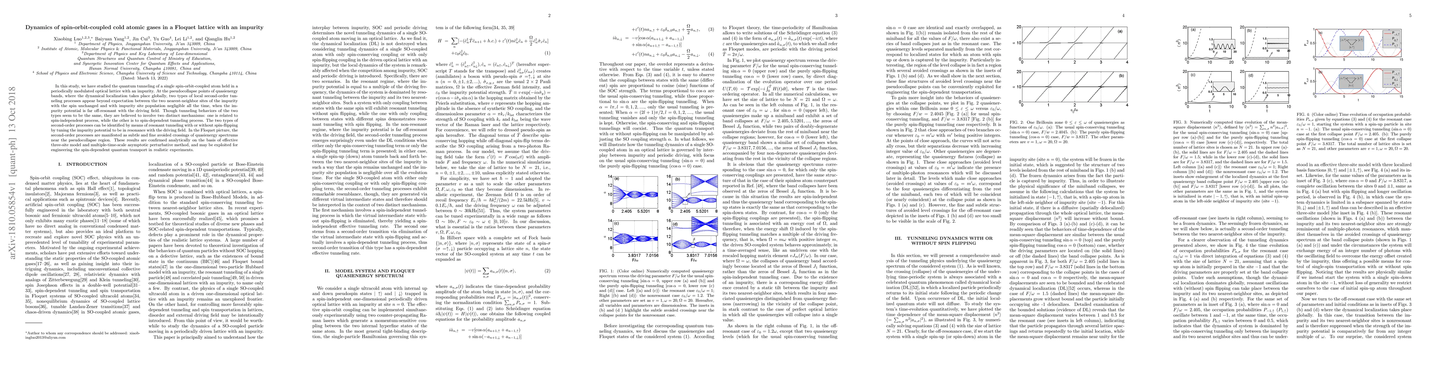 In this study, we have studied the quantum tunneling of a single spin-orbit-coupled atom held in a periodically modulated optical lattice with an impurity. At the pseudocollapse points of quasienergy bands, where the dynamical localization takes place globally, two types of local second-order tunneling processes appear beyond expectation between the two nearest-neighbor sites of the impurity with the spin unchanged and with impurity site population negligible all the time, when the impurity potential is far off-resonant with the driving field. Though tunneling behaviors of the two types seem to be the same, they are believed to involve two distinct mechanisms: one is related to spin-independent process, while the other is to spin-dependent tunneling process. The two types of second-order processes can be identified by means of resonant tunneling with or without spin-flipping by tuning the impurity potential to be in resonance with the driving field. In the Floquet picture, the second-order processes are manifested as subtle and fine avoided crossings of quasienergy spectrums near the pseudocollapse region. These results are confirmed analytically on the basis of effective three-site model and multiple-time-scale asymptotic perturbative method, and may be exploited for engineering the spin-dependent quantum transport in realistic experiments.