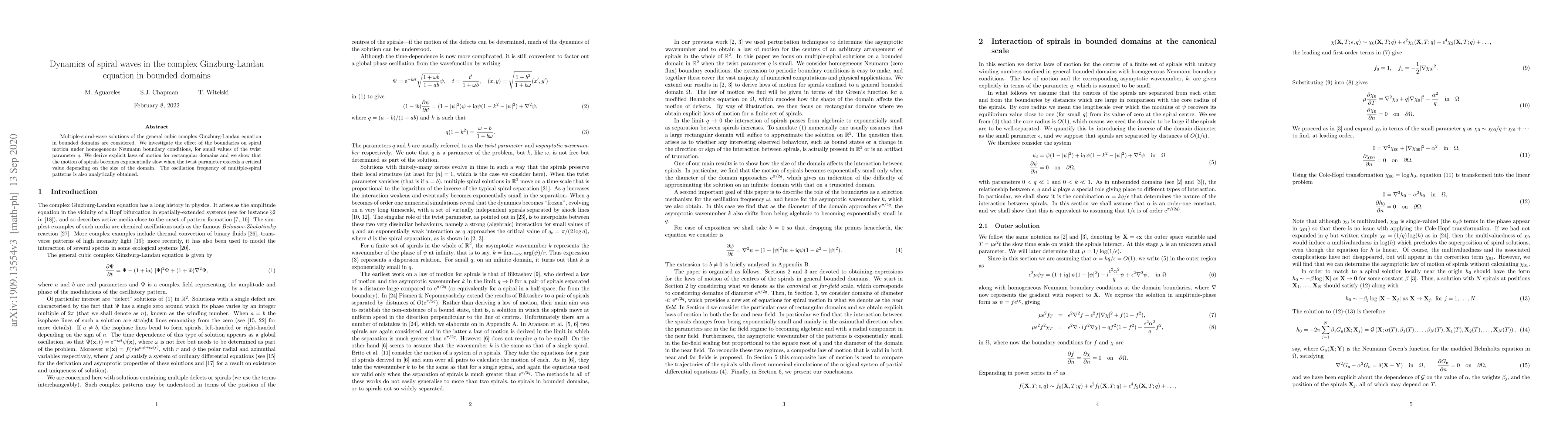 This paper examines the behavior of spiral waves in the complex Ginzburg-Landau equation within bounded domains, focusing on the influence of boundaries on spiral motion under Neumann conditions. The study reveals that spiral motion slows exponentially when the twist parameter surpasses a critical value, contingent on domain size, and provides analytical expressions for the oscillation frequency of multiple-spiral patterns.