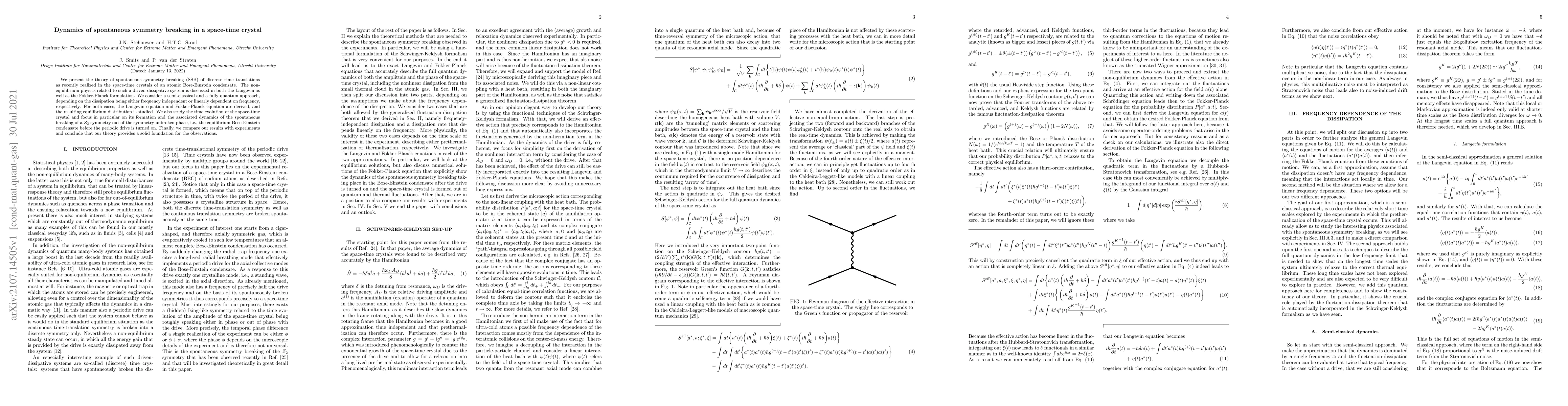 We present the theory of spontaneous symmetry breaking (SSB) of discrete time translations as recently realized in the space-time crystals of an atomic Bose-Einstein condensate. The non-equilibrium physics related to such a driven-dissipative system is discussed in both the Langevin as well as the Fokker-Planck formulation. We consider a semi-classical and a fully quantum approach, depending on the dissipation being either frequency independent or linearly dependent on frequency, respectively. For both cases, the Langevin equation and Fokker-Planck equation are derived, and the resulting equilibrium distribution is studied. We also study the time evolution of the space-time crystal and focus in particular on its formation and the associated dynamics of the spontaneous breaking of a Z2 symmetry out of the symmetry unbroken phase, i.e., the equilibrium Bose-Einstein condensate before the periodic drive is turned on. Finally, we compare our results with experiments and conclude that our theory provides a solid foundation for the observations.