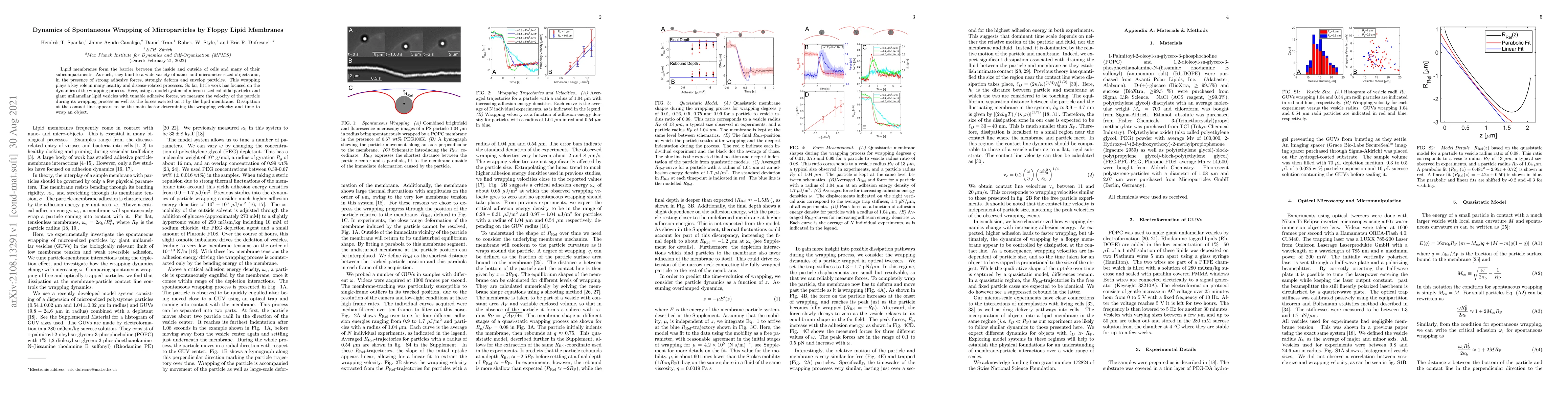 This study investigates the dynamics of spontaneous wrapping of microparticles by floppy lipid membranes, focusing on the velocity and forces involved. The research reveals that dissipation at the contact line significantly influences the wrapping velocity and time.