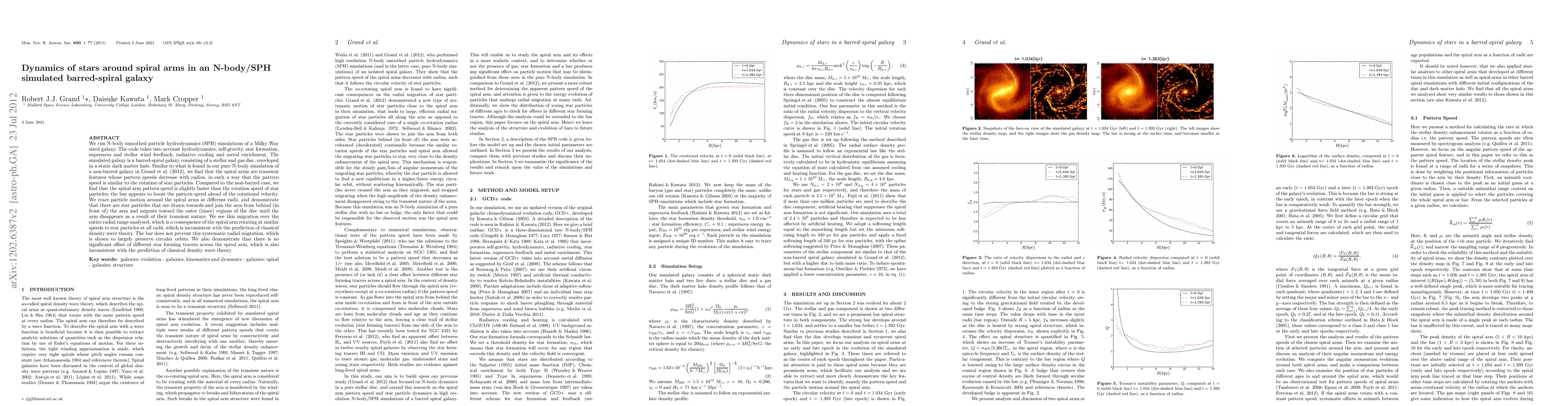This research uses N-body/SPH simulations to explore star dynamics in a barred-spiral galaxy, finding that star particles migrate radially while the spiral arms rotate faster than predicted by classical density wave theory. Despite the bar's presence, systematic radial migration and circular orbits are preserved.