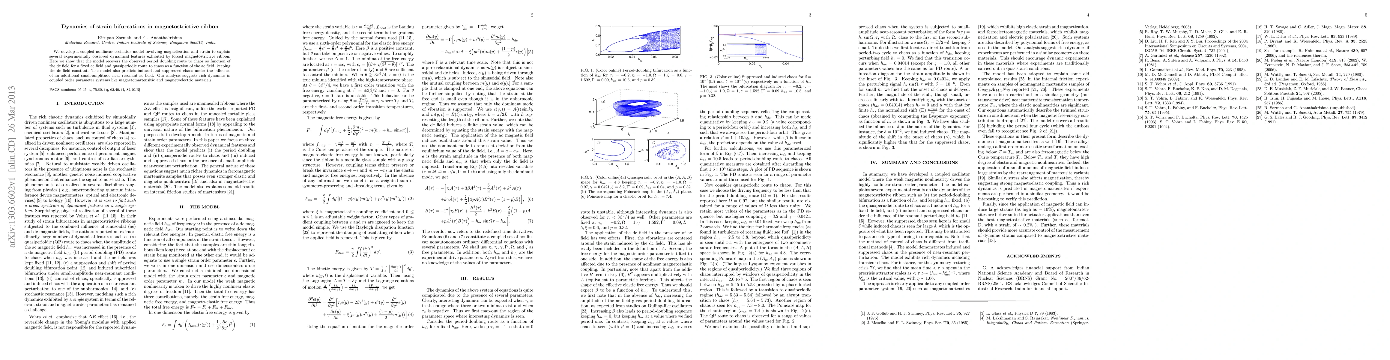 A study of a coupled nonlinear oscillator model explains experimentally observed dynamics in magnetostrictive ribbons, including period doubling to chaos with varying DC fields and quasiperiodic routes to chaos with AC fields.