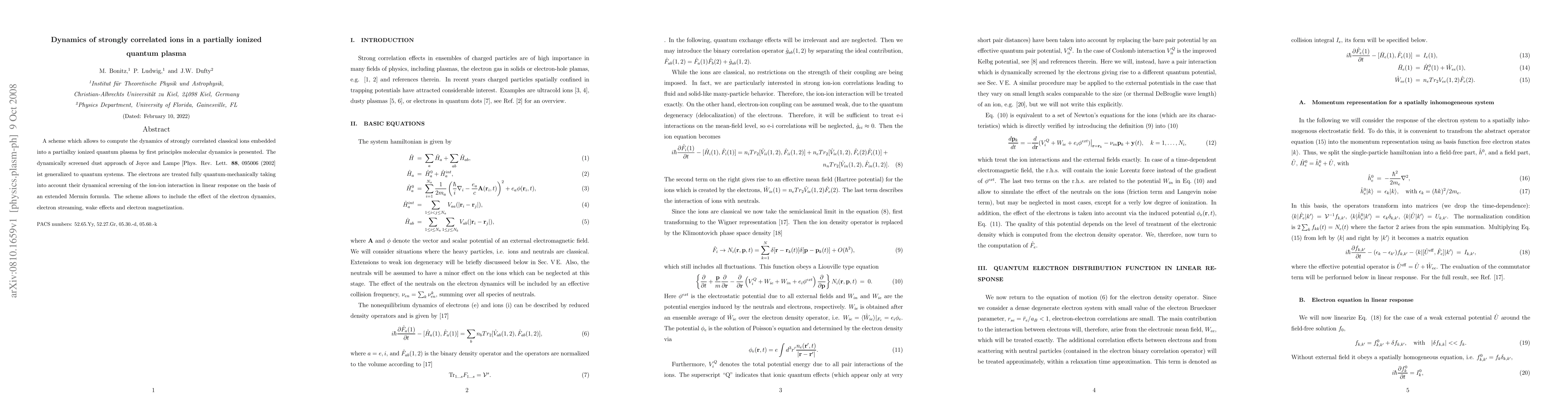 A scheme which allows to compute the dynamics of strongly correlated classical ions embedded into a partiallzy ionized quantum plasma by first principles molecular dynamics is presented. The dynamically screened dust approach of Joyce and Lampe [Phys. Rev. Lett. {\bf 88}, 095006 (2002] ist generalized to quantum systems. The electrons are treated fully quantum-mechanically taking into account their dynamical screening of the ion-ion interaction in linear response on the basis of an extended Mermin formula. The scheme allows to include the effect of the electron dynamics, electron streaming, wake effects and electron magnetization.