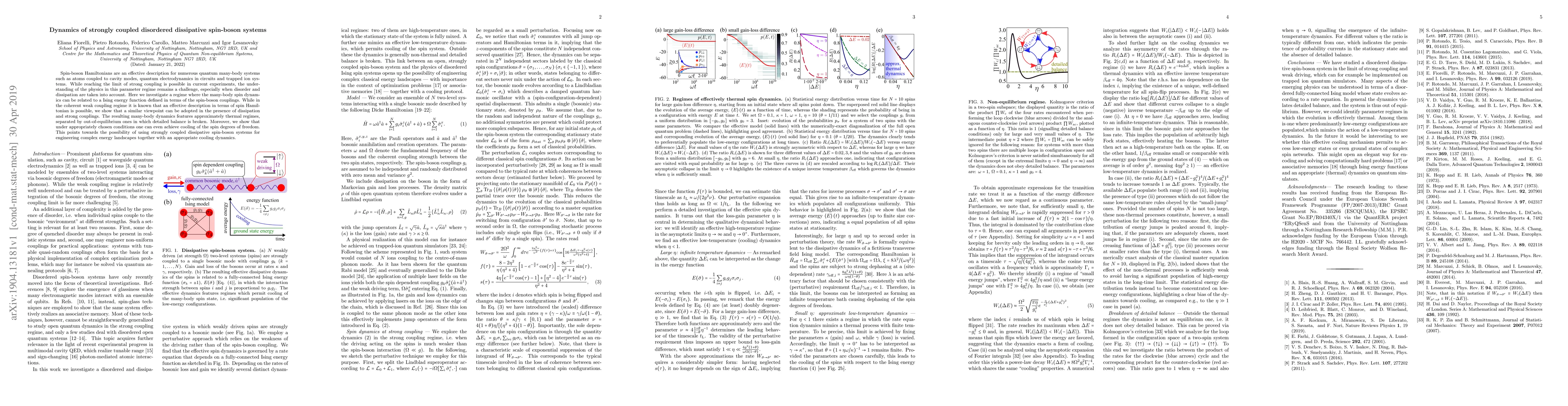 Spin-boson Hamiltonians are an effective description for numerous quantum many-body systems such as atoms coupled to cavity modes, quantum electrodynamics in circuits and trapped ion systems. While reaching the limit of strong coupling is possible in current experiments, the understanding of the physics in this parameter regime remains a challenge, especially when disorder and dissipation are taken into account. Here we investigate a regime where the many-body spin dynamics can be related to a Ising energy function defined in terms of the spin-boson couplings. While in the coherent weak coupling regime it is known that an effective description in terms of spin Hamiltonian is possible, we show that a similar viewpoint can be adopted in the presence of dissipation and strong couplings. The resulting many-body dynamics features approximately thermal regimes, separated by out-of-equilibrium ones in which detailed balance is broken. Moreover, we show that under appropriately chosen conditions one can even achieve cooling of the spin degrees of freedom. This points towards the possibility of using strongly coupled dissipative spin-boson systems for engineering complex energy landscapes together with an appropriate cooling dynamics.