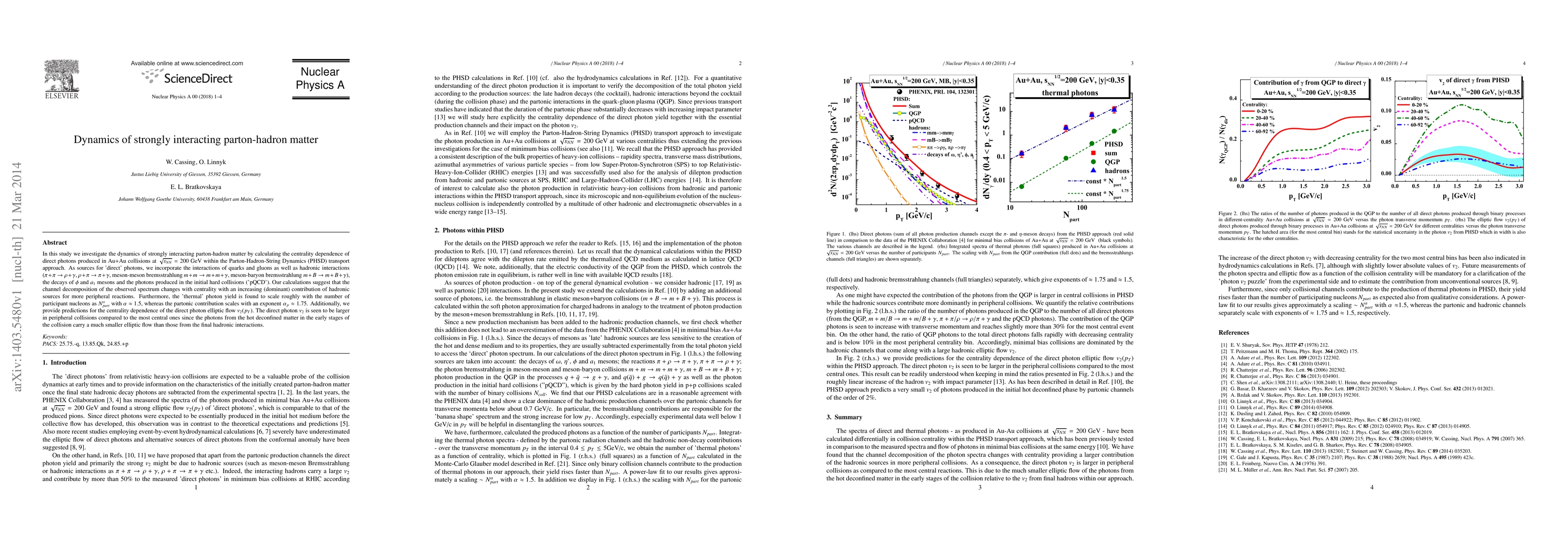 In this study we investigate the dynamics of strongly interacting parton-hadron matter by calculating the centrality dependence of direct photons produced in Au+Au collisions at $\sqrt{s_{NN}}=200$ GeV within the Parton-Hadron-String Dynamics (PHSD) transport approach. As sources for 'direct' photons, we incorporate the interactions of quarks and gluons as well as hadronic interactions ($\pi+\pi\to\rho+\gamma$, $\rho+\pi\to\pi+\gamma$, meson-meson bremsstrahlung $m+m\to m+m+\gamma$, meson-baryon bremsstrahlung $m+B\to m+B+\gamma$), the decays of $\phi$ and $a_1$ mesons and the photons produced in the initial hard collisions ('pQCD'). Our calculations suggest that the channel decomposition of the observed spectrum changes with centrality with an increasing (dominant) contribution of hadronic sources for more peripheral reactions. Furthermore, the 'thermal' photon yield is found to scale roughly with the number of participant nucleons as $N_{part}^\alpha$ with $\alpha \approx$ 1.5, whereas the partonic contribution scales with an exponent $\alpha_p \approx1.75$. Additionally, we provide predictions for the centrality dependence of the direct photon elliptic flow $v_2(p_T)$. The direct photon $v_2$ is seen to be larger in peripheral collisions compared to the most central ones since the photons from the hot deconfined matter in the early stages of the collision carry a much smaller elliptic flow than those from the final hadronic interactions.
