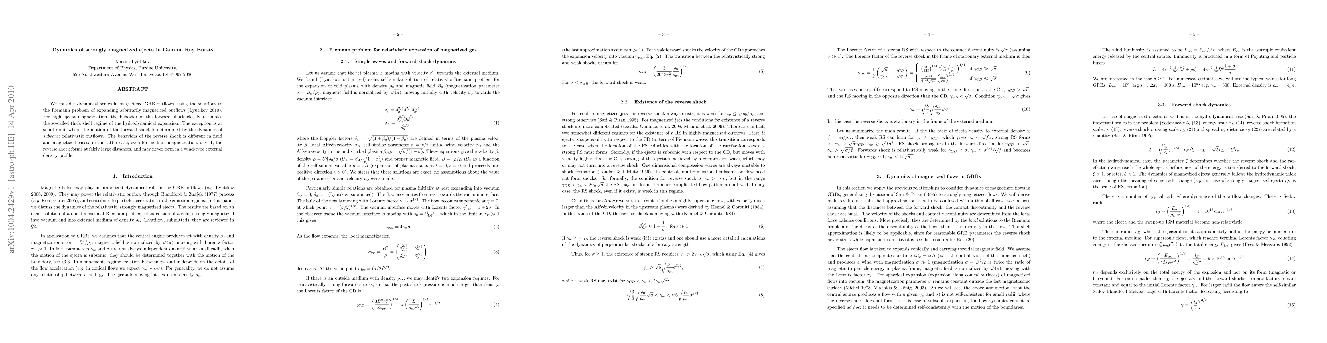 We consider dynamical scales in magnetized GRB outflows, using the solutions to the Riemann problem of expanding arbitrarily magnetized outflows (Lyutikov 2010). For high ejecta magnetization, the behavior of the forward shock closely resembles the so-called thick shell regime of the hydrodynamical expansion. The exception is at small radii, where the motion of the forward shock is determined by the dynamics of subsonic relativistic outflows. The behaviors of the reverse shock is different in fluid and magnetized cases: in the latter case, even for medium magnetization, sigma ~ 1, the reverse shock forms at fairly large distances, and may never form in a wind-type external density profile.