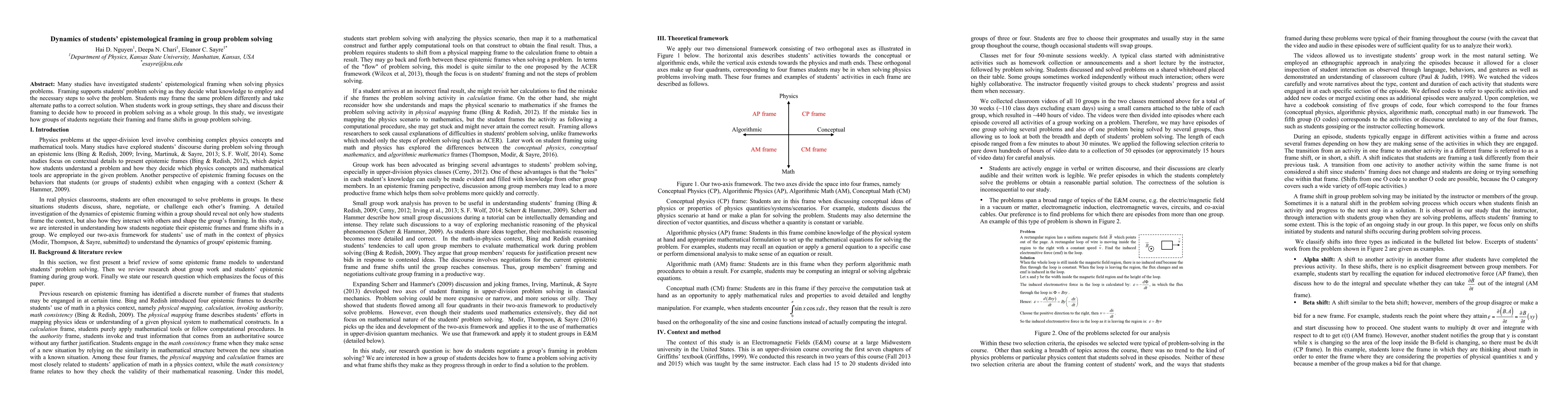 This study explores how students' epistemological framing evolves during group problem-solving sessions, focusing on how they negotiate and shift their framing to collaboratively decide on the best approach to solving problems. The research highlights the dynamic nature of framing in shared problem-solving contexts.