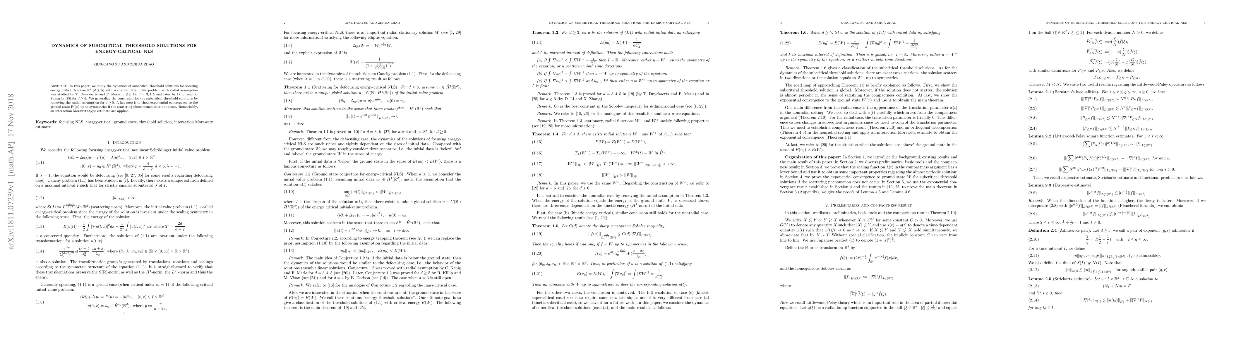 In this paper, we study the dynamics of subcritical threshold solutions for focusing energy critical NLS on $\mathbb{R}^d$ ($d\geq 5$) with nonradial data. This problem with radial assumption was studied by T. Duyckaerts and F. Merle in \cite{DM} for $d=3,4,5$ and later by D. Li and X. Zhang in \cite{LZ} for $d \geq 6$. We generalize the conclusion for the subcritical threshold solutions by removing the radial assumption for $d\geq 5$. A key step is to show exponential convergence to the ground state $W(x)$ up to symmetries if the scattering phenomenon does not occur. Remarkably, an interaction Morawetz-type estimate are applied.
