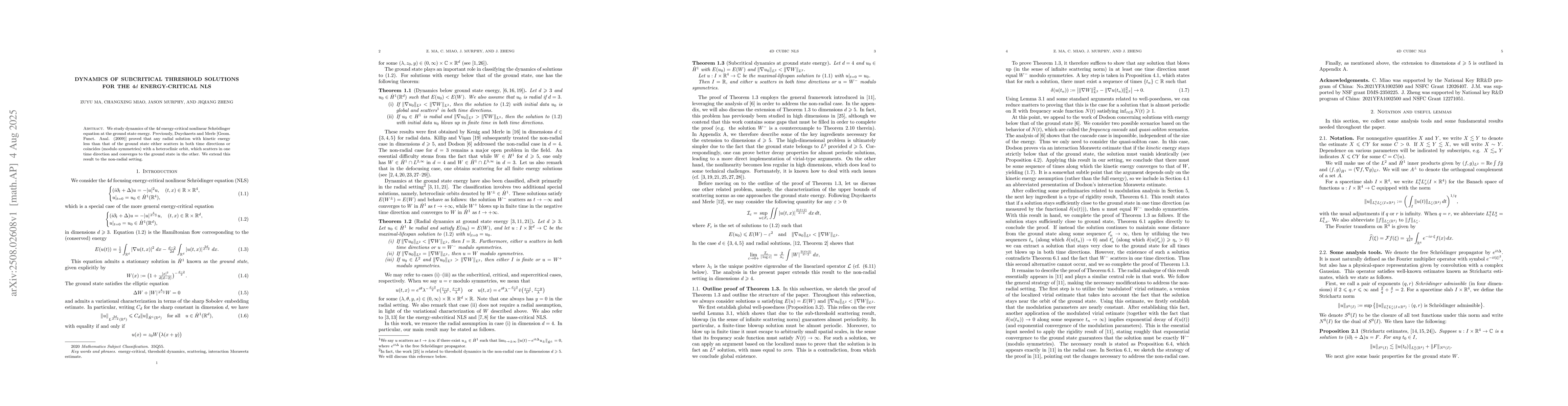 This research extends previous findings on the 4D energy-critical NLS (Nonlinear Schrödinger Equation) to non-radial solutions. It builds on earlier work by Duyckaerts and Merle, proving that non-radial solutions with energy less than the ground state either scatter in both time directions or follow a heteroclinic orbit that scatters in one direction and converges to the ground state in the other.