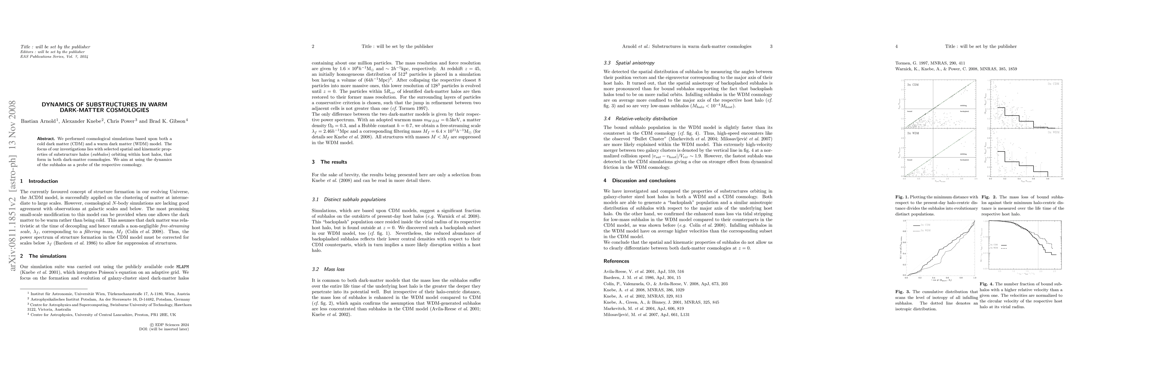 We performed cosmological simulations based upon both a cold dark matter (CDM) and a warm dark matter (WDM) model. The focus of our investigations lies with selected spatial and kinematic properties of substructure halos (subhalos) orbiting within host halos, that form in both dark-matter cosmologies. We aim at using the dynamics of the subhalos as a probe of the respective cosmology.