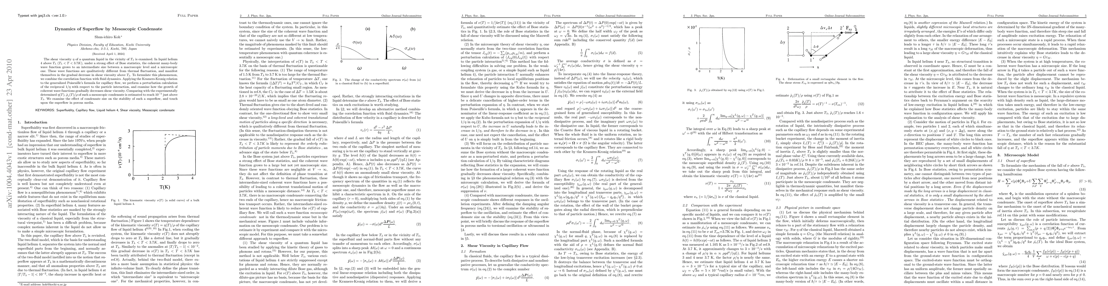 This paper investigates the shear viscosity dynamics in liquid helium 4 near the lambda point ($T_{\lambda}$), revealing a decrease in viscosity due to the growth of Bose-Einstein coherent wave functions. The study combines correlation functions with fluid dynamics to analyze the effect of particle interaction on viscosity, estimating the stability of superflow in mesoscopic condensates.