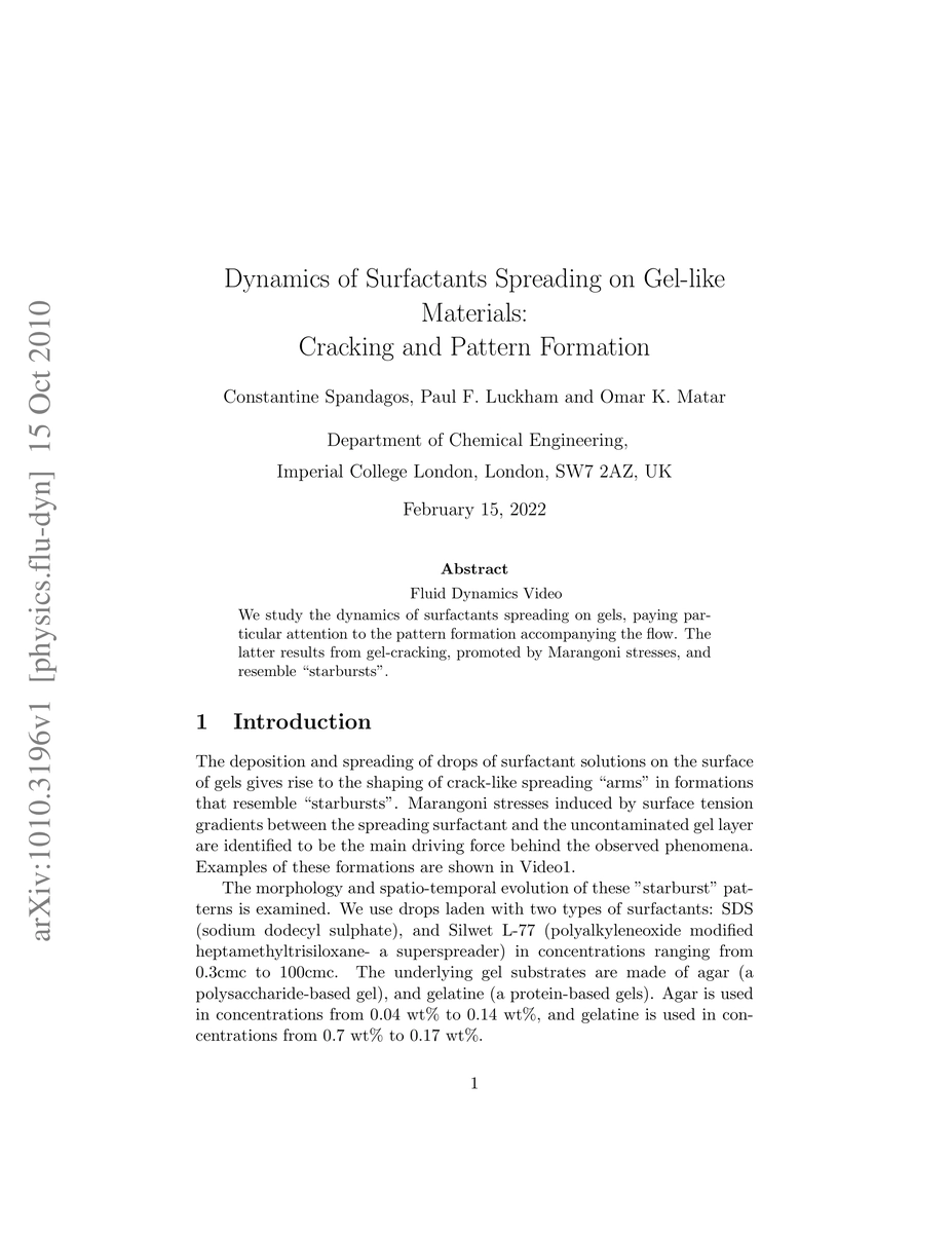 This paper investigates how surfactants spread on gel-like materials, focusing on the cracking and pattern formation caused by Marangoni stresses, which create starburst-like structures. The study highlights the interplay between surfactant dynamics and gel deformation.