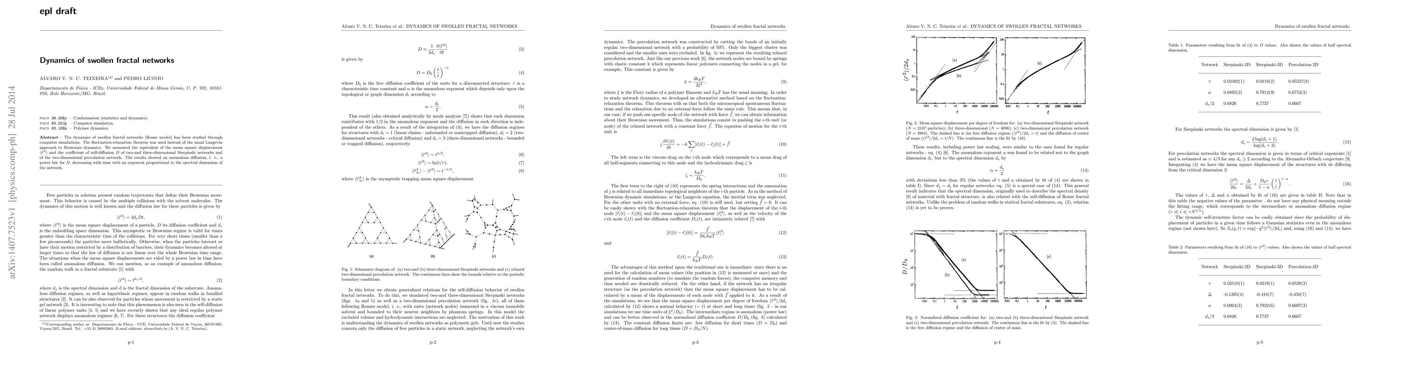 Researchers used computer simulations to study the dynamics of swollen fractal networks, finding anomalous diffusion with a power-law relationship between diffusion coefficient and time, depending on the network's spectral dimension.