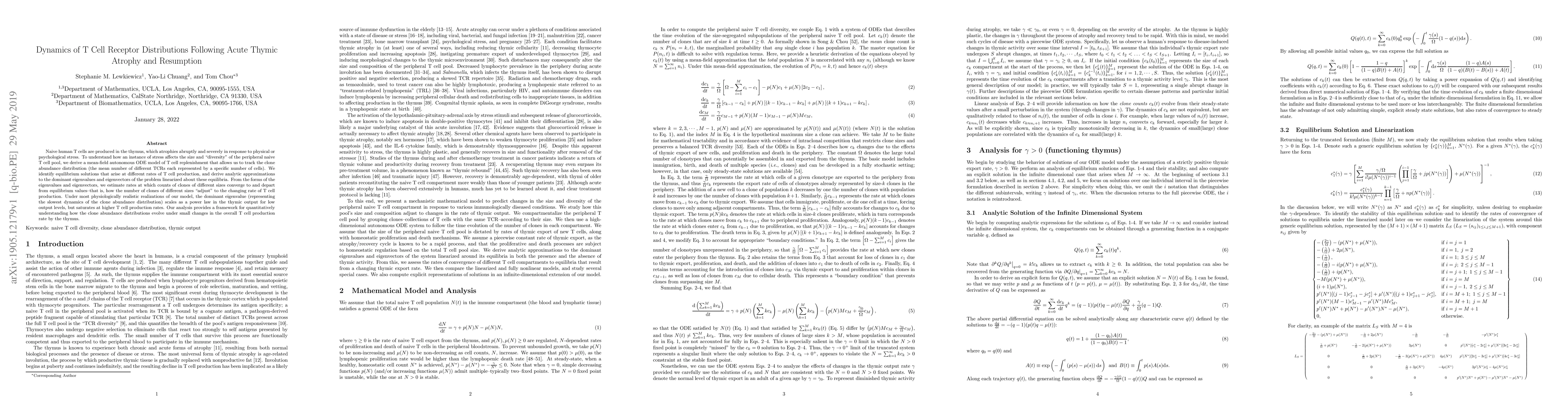 This paper develops a mathematical model to study how T cell receptor distributions adjust following acute thymic atrophy and resumption. It finds that the slowest dynamics of clone abundance distribution scale as a power law for low thymic output but saturate at higher production rates.
