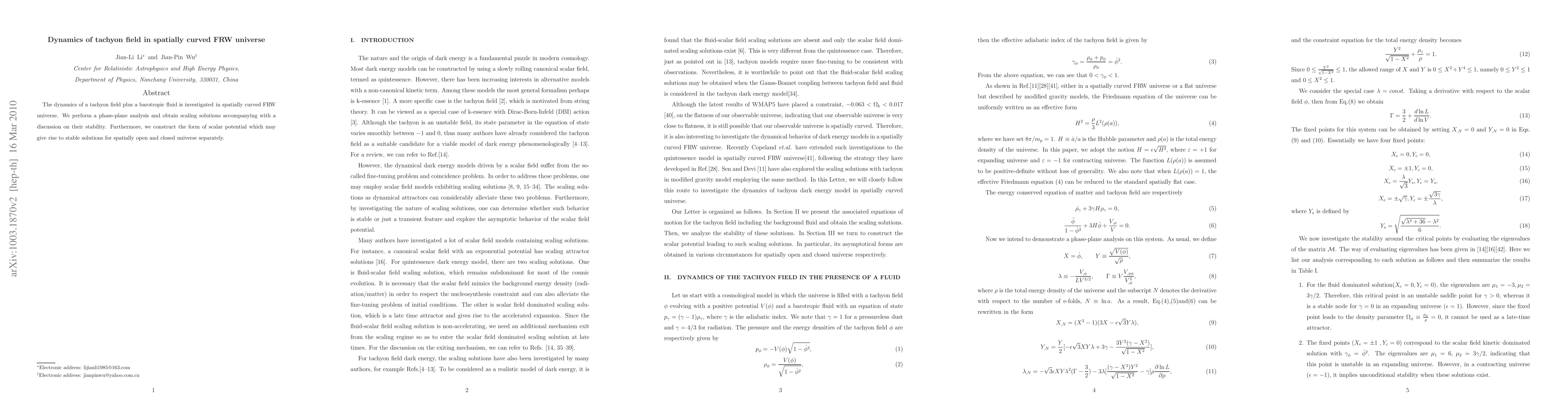 This paper explores the dynamics of a tachyon field in a spatially curved FRW universe alongside a barotropic fluid, employing phase-plane analysis to find scaling solutions and discussing their stability. It also constructs scalar potentials that yield stable solutions for both open and closed universes.