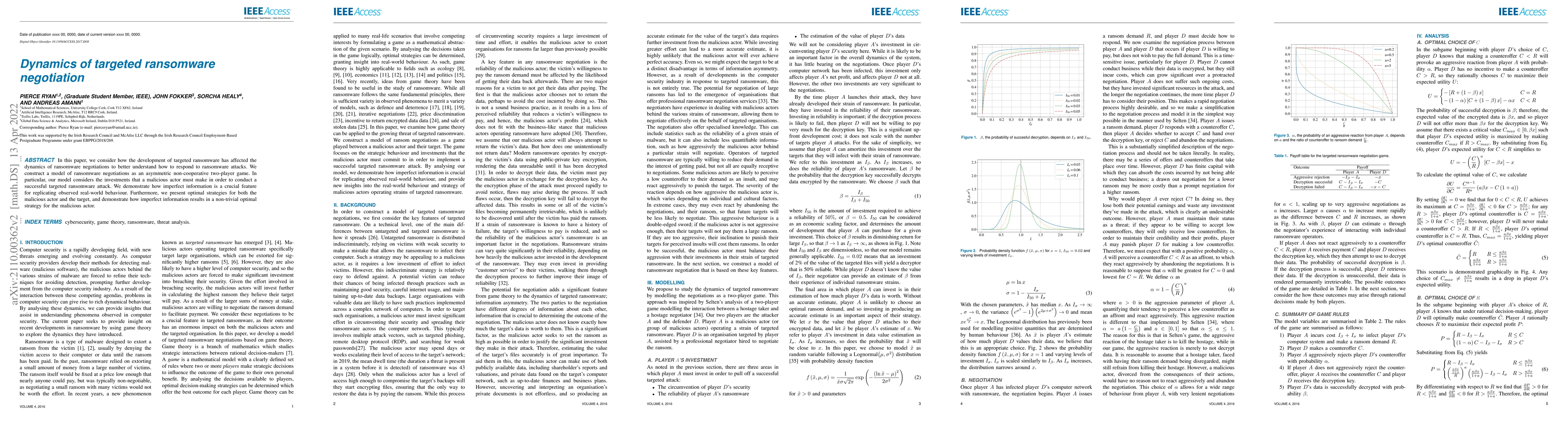This paper models ransomware negotiations as an asymmetric two-player game, analyzing the investments made by attackers and the strategies employed by targets. It highlights the importance of imperfect information in replicating real-world negotiation dynamics and presents optimal strategies for both parties.