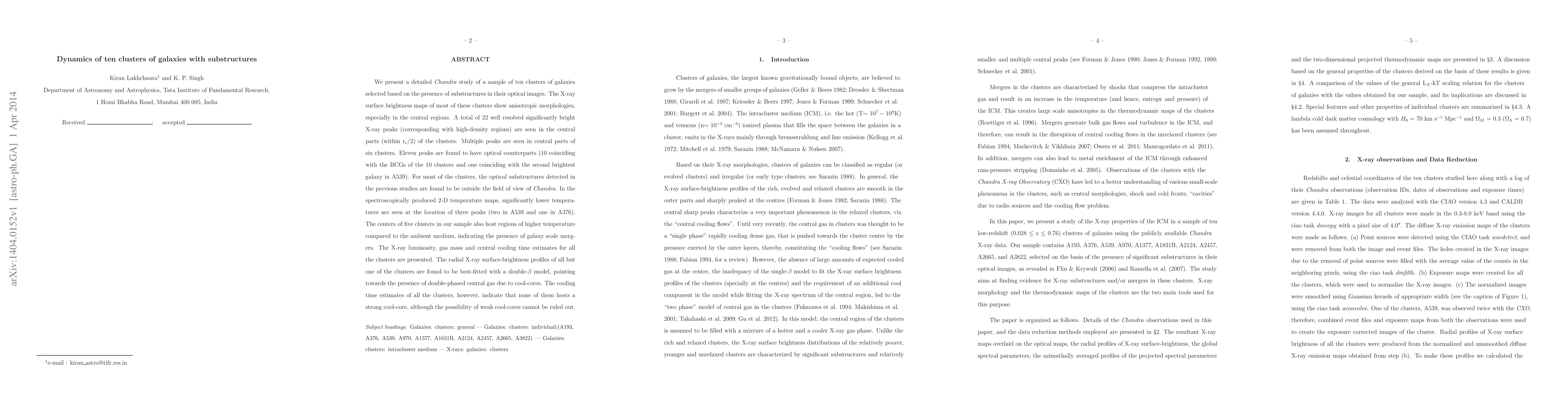 We present a detailed Chandra study of a sample of ten clusters of galaxies selected based on the presence of substructures in their optical images. The X-ray surface brightness maps of most of these clusters show anisotropic morphologies, especially in the central regions. A total of 22 well resolved significantly bright X-ray peaks (corresponding with high-density regions) are seen in the central parts (within r$_{\rm c}/2$) of the clusters. Multiple peaks are seen in central parts of six clusters. Eleven peaks are found to have optical counterparts (10 coinciding with the BCGs of the 10 clusters and one coinciding with the second brightest galaxy in A539). For most of the clusters, the optical substructures detected in the previous studies are found to be outside the field of view of Chandra. In the spectroscopically produced 2-D temperature maps, significantly lower temperatures are seen at the location of three peaks (two in A539 and one in A376). The centres of five clusters in our sample also host regions of higher temperature compared to the ambient medium, indicating the presence of galaxy scale mergers. The X-ray luminosity, gas mass and central cooling time estimates for all the clusters are presented. The radial X-ray surface-brightness profiles of all but one of the clusters are found to be best-fitted with a double-$\beta$ model, pointing towards the presence of double-phased central gas due to cool-cores. The cooling time estimates of all the clusters, however, indicate that none of them hosts a strong cool-core, although the possibility of weak cool-cores cannot be ruled out.