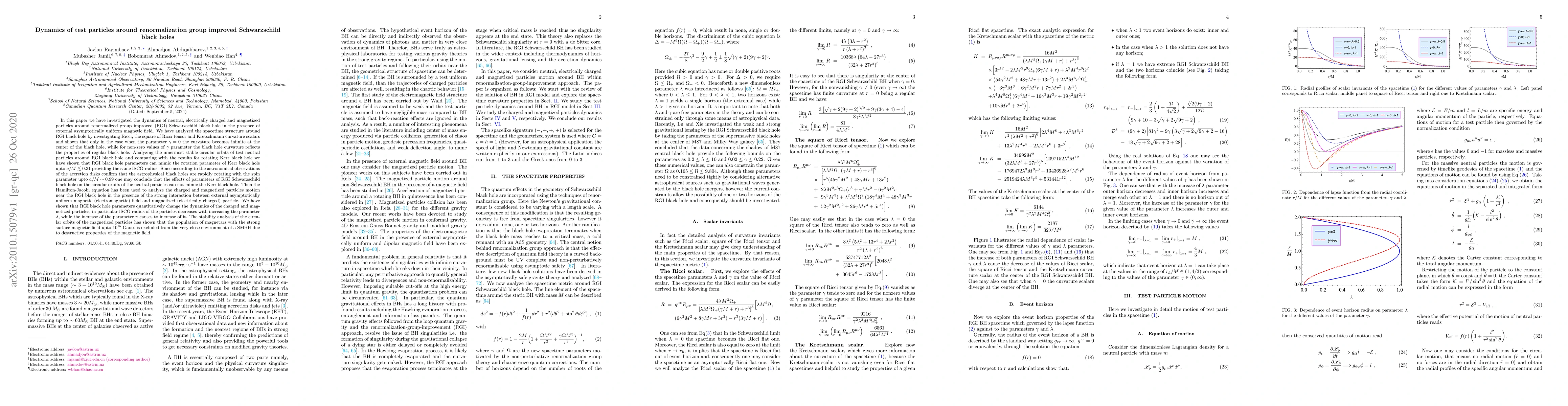 In this paper we have investigated the dynamics of neutral, electrically charged and magnetized particles around renormalized group improved (RGI) Schwarzschild black hole in the presence of external asymptotically uniform magnetic field. We have analyzed the spacetime structure around RGI black hole by investigating Ricci, the square of Ricci tensor and Kretschmann curvature scalars and shown that only in the case when the parameter $\gamma=0$ the curvature becomes infinite at the center of the black hole, while for non-zero values of $\gamma$ parameter the black hole curvature reflects the properties of regular black hole. Analyzing the innermost stable circular orbits of test neutral particles around RGI black hole and comparing with the results for rotating Kerr black hole we have shown that RGI black hole parameters can mimic the rotation parameter of Kerr black hole upto $a/M \lesssim 0.31$ providing the same ISCO radius. Since according to the astronomical observations of the accretion disks confirm that the astrophysical black holes are rapidly rotating with the spin parameter upto $a/M \sim 0.99$ one may conclude that the effects of parameters of RGI Schwarzschild black hole on the circular orbits of the neutral particles can not mimic the Kerr black hole. Then the Hamilton-Jacobi equation has been used to analyze the charged and magnetized particles motion near the RGI black hole in the presence of the strong interaction between external asymptotically uniform magnetic (electromagnetic) field and magnetized (electrically charged) particle. We have shown that RGI black hole parameters quantitatively change the dynamics of the charged and magnetized particles, in particular ISCO radius of the particles decreases with increasing the parameter $\lambda$, while the increase of the parameter $\gamma$ causes to increase of it.