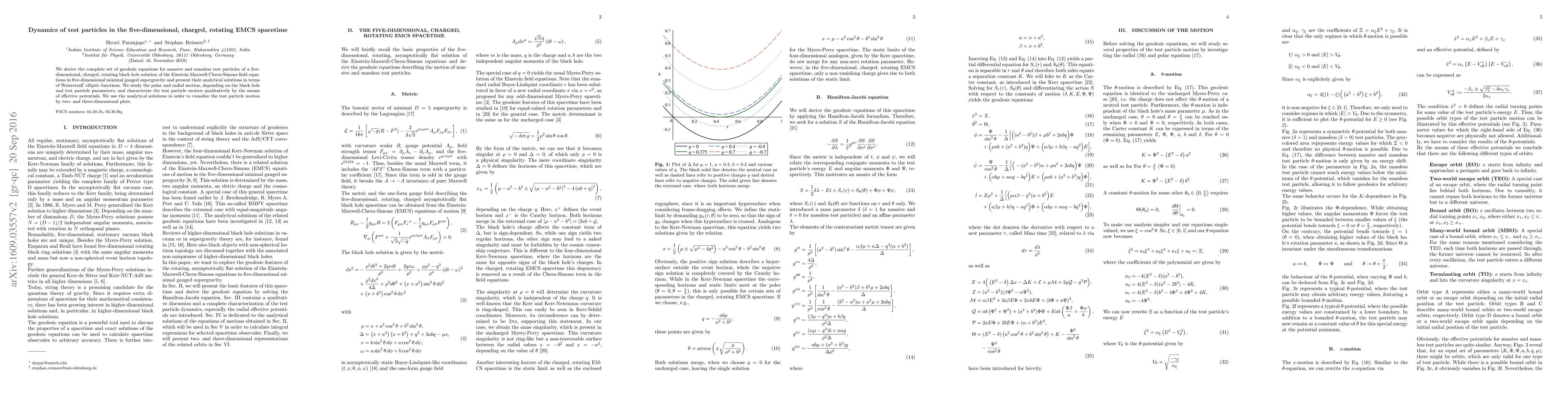 This paper derives geodesic equations for test particles in a 5D charged rotating black hole solution, analyzing polar and radial motion with effective potentials to visualize test particle trajectories.