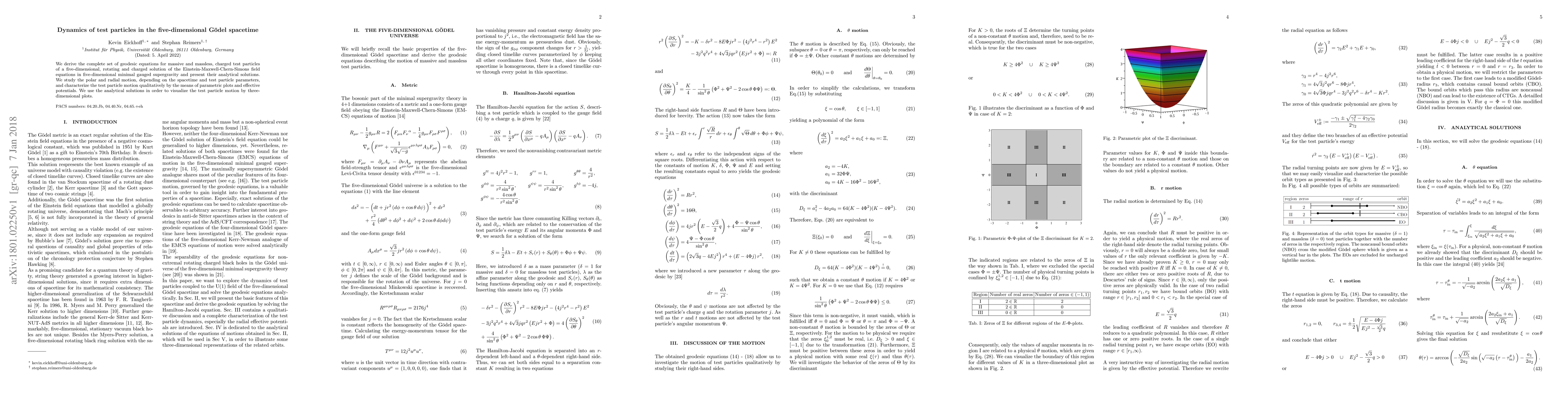 We derive the complete set of geodesic equations for massive and massless, charged test particles of a five-dimensional, rotating and charged solution of the Einstein-Maxwell-Chern-Simons field equations in five-dimensional minimal gauged supergravity and present their analytical solutions. We study the polar and radial motion, depending on the spacetime and test particle parameters, and characterize the test particle motion qualitatively by the means of parametric plots and effective potentials. We use the analytical solutions in order to visualize the test particle motion by three-dimensional plots.