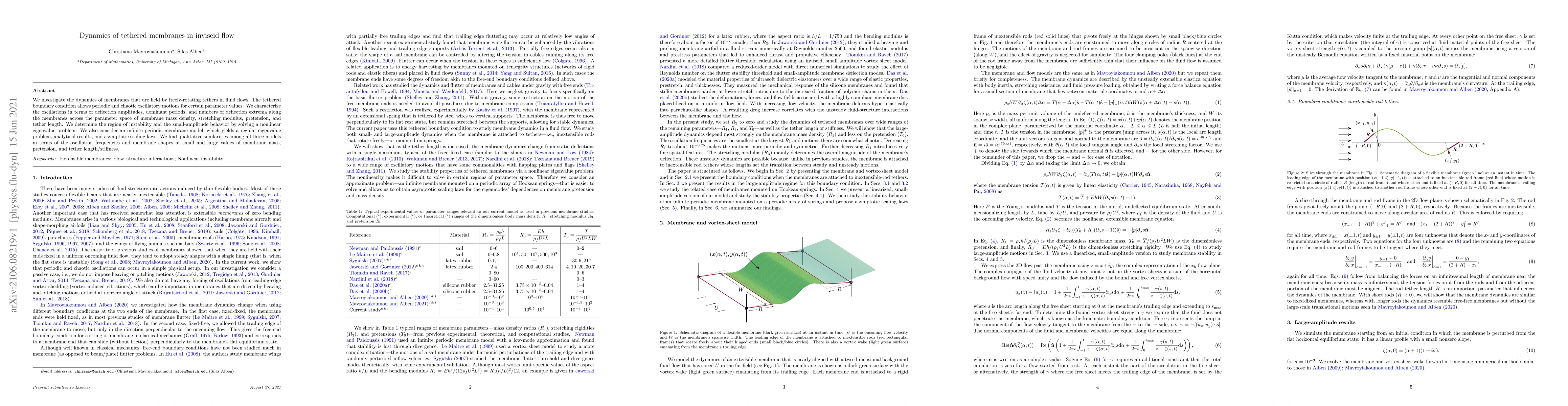 This paper explores the dynamics of membranes tethered by freely-rotating tethers in fluid flows, identifying periodic and chaotic oscillatory behaviors. It characterizes these oscillations and determines regions of instability and small-amplitude behavior through a nonlinear eigenvalue problem, revealing qualitative similarities across different models.