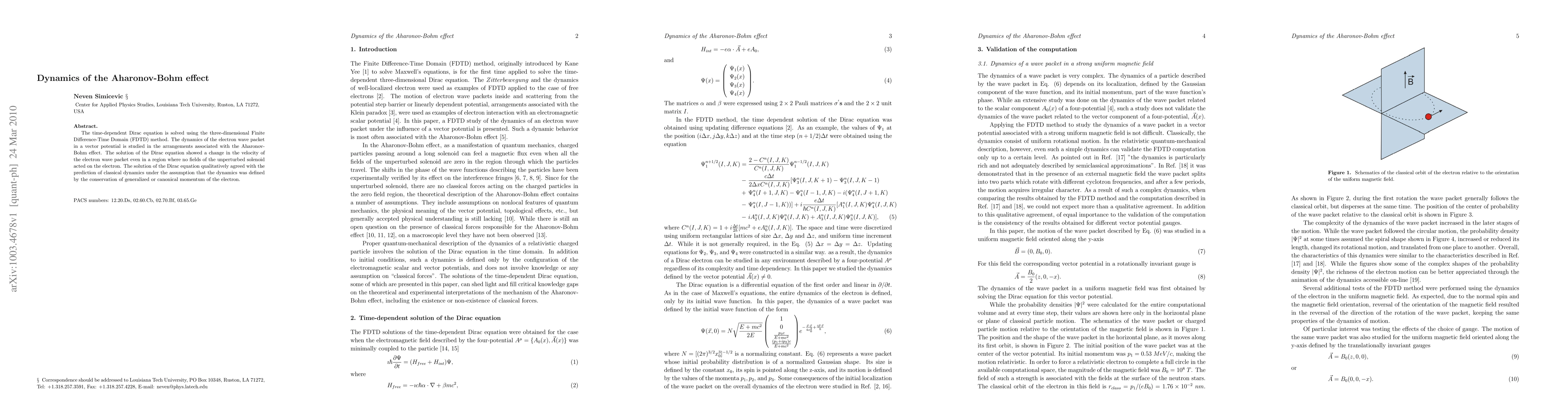 This paper investigates the dynamics of the Aharonov-Bohm effect using the FDTD method to solve the time-dependent Dirac equation. It reveals that the electron wave packet's velocity changes in regions devoid of direct field influence, aligning with classical dynamics based on momentum conservation.