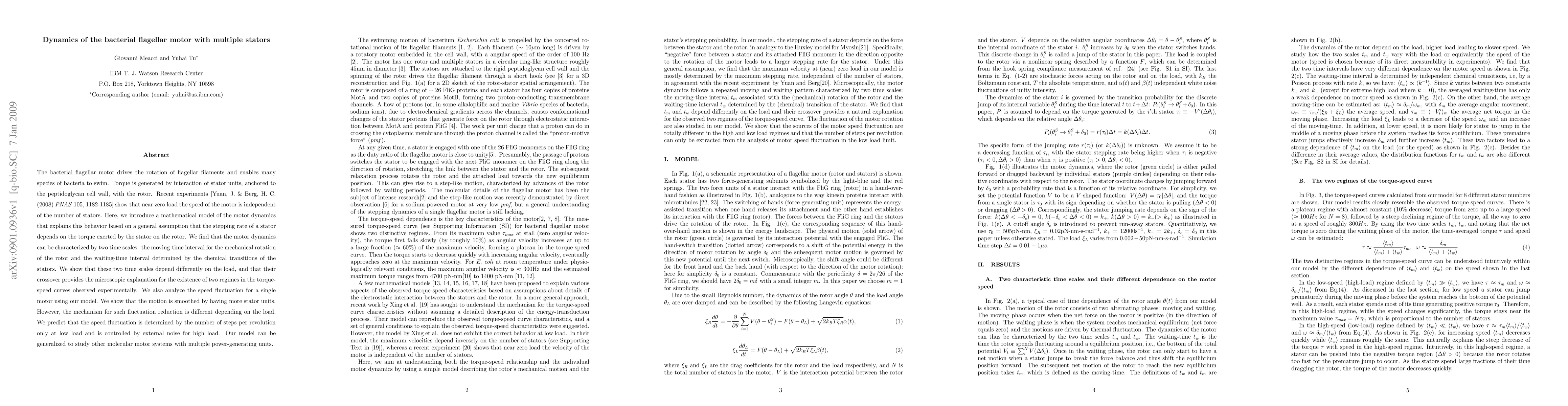 This paper presents a mathematical model explaining the dynamics of bacterial flagellar motors with multiple stators, showing that motor speed near zero load is independent of stator count. The model identifies two time scales for motor dynamics and predicts different mechanisms for speed fluctuation reduction depending on load, suggesting the model's applicability to other molecular motor systems.