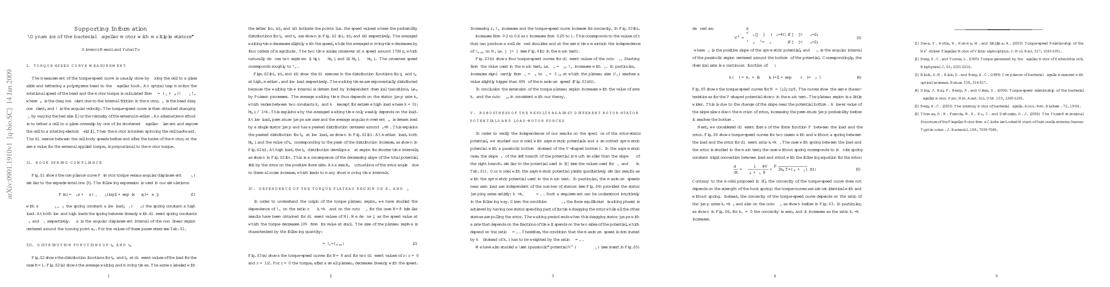 In this supporting information we briefly describe the torque-speed measurement procedure. We show the hook spring compliance used in the simulations. We analyze the distribution functions of the moving and waiting time intervals. We study the dependence of the torque plateau region on the stator jumping rate and the cutoff angle, and the robustness of the results against different rotor-stator- potential and load-rotor forces.