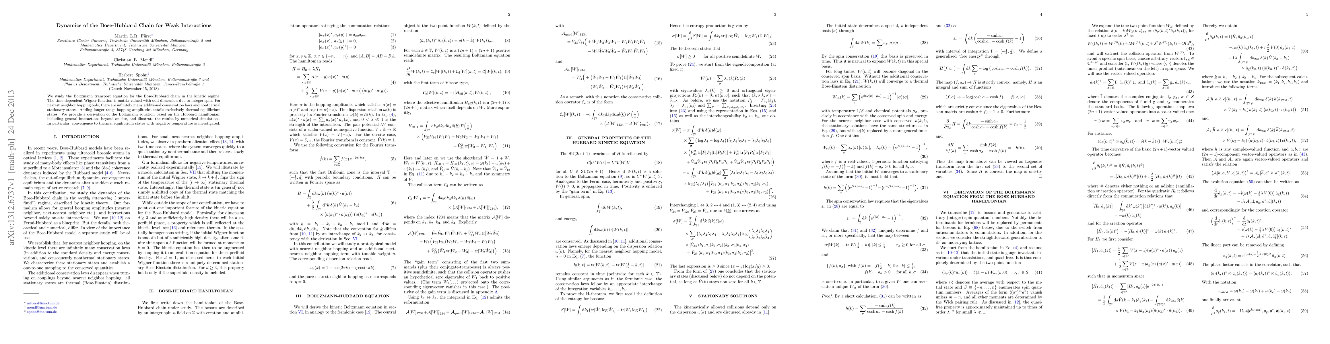 We study the Boltzmann transport equation for the Bose-Hubbard chain in the kinetic regime. The time-dependent Wigner function is matrix-valued with odd dimension due to integer spin. For nearest neighbor hopping only, there are infinitely many additional conservation laws and nonthermal stationary states. Adding longer range hopping amplitudes entails exclusively thermal equilibrium states. We provide a derivation of the Boltzmann equation based on the Hubbard hamiltonian, including general interactions beyond on-site, and illustrate the results by numerical simulations. In particular, convergence to thermal equilibrium states with negative temperature is investigated.