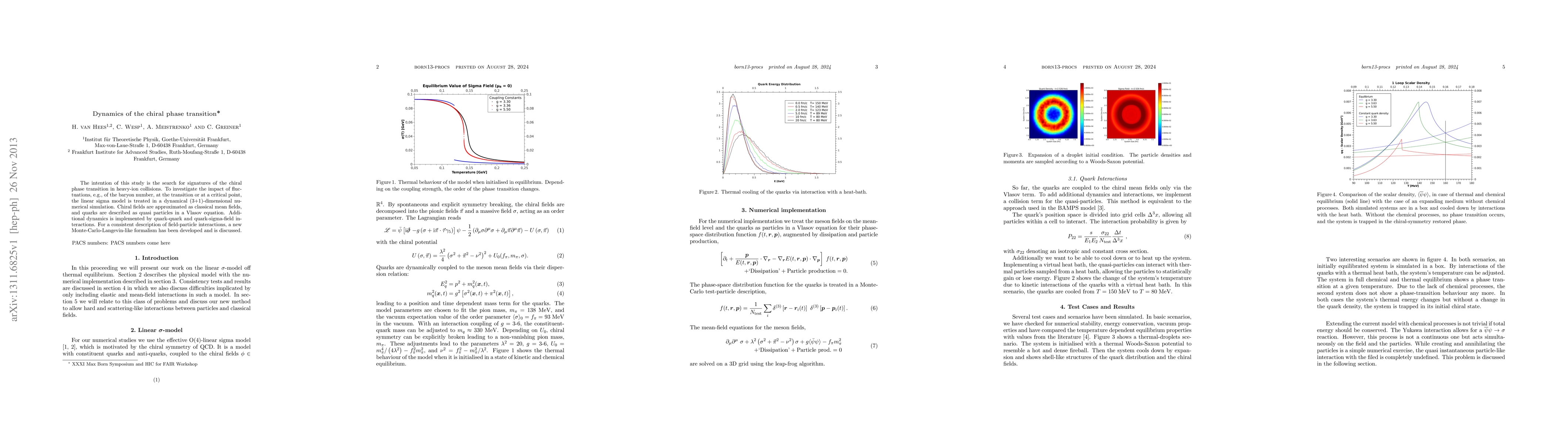 The intention of this study is the search for signatures of the chiral phase transition in heavy-ion collisions. To investigate the impact of fluctuations, e.g., of the baryon number, at the transition or at a critical point, the linear sigma model is treated in a dynamical (3+1)-dimensional numerical simulation. Chiral fields are approximated as classical mean fields, and quarks are described as quasi particles in a Vlasov equation. Additional dynamics is implemented by quark-quark and quark-sigma-field interactions. For a consistent description of field-particle interactions, a new Monte-Carlo-Langevin-like formalism has been developed and is discussed.
