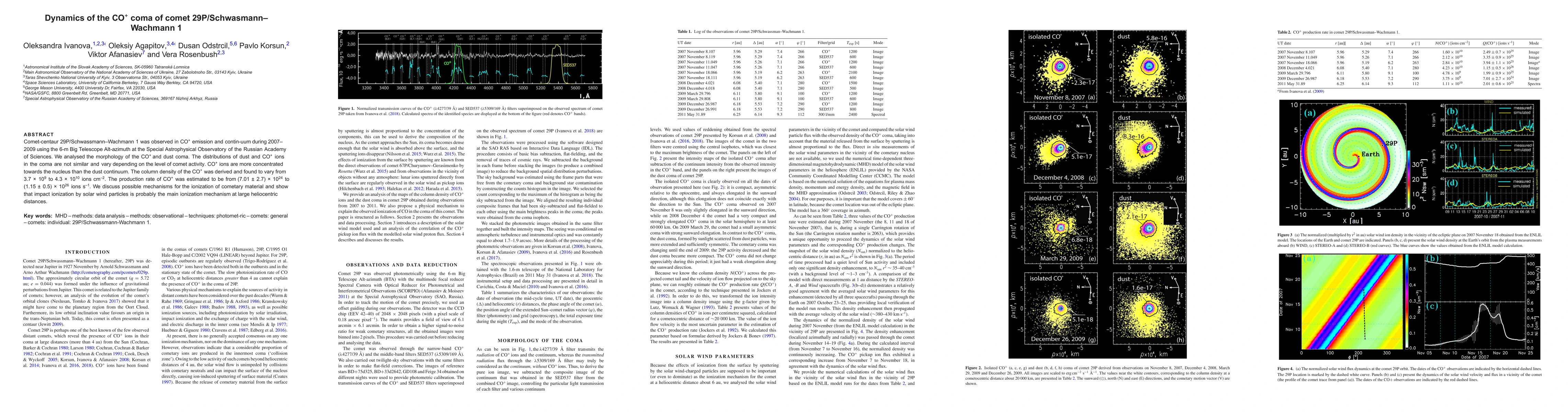 Comet 29P/Schwassmann-Wachmann 1's CO+ coma was analyzed, showing varying concentrations of dust and CO+ ions depending on comet activity. The column density of CO+ ranged from 3.7*10^9 to 4.3*10^10 ions cm^-2.
