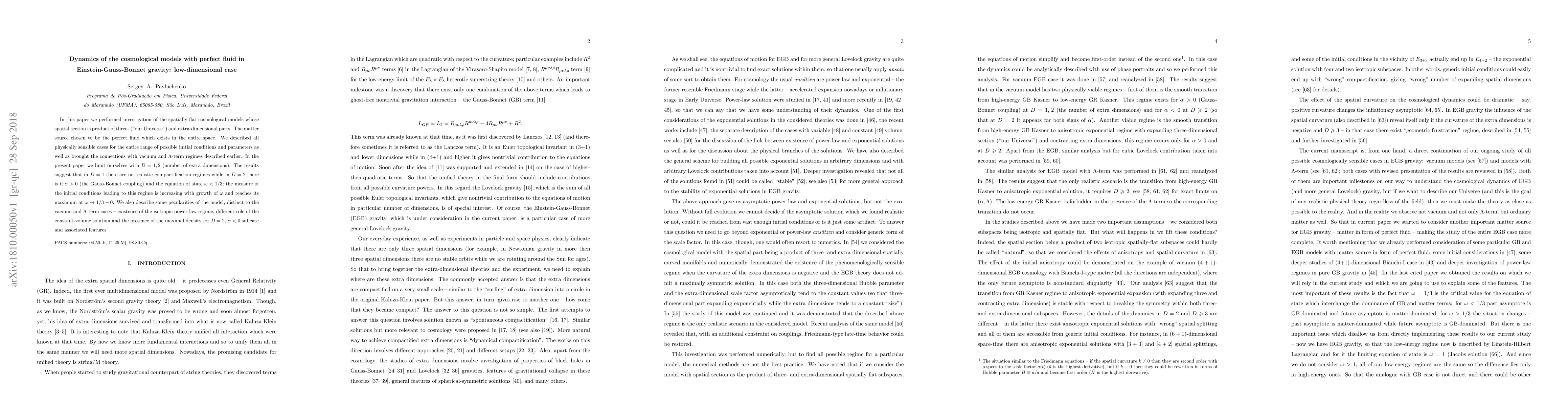 In this paper we performed investigation of the spatially-flat cosmological models whose spatial section is product of three- ("our Universe") and extra-dimensional parts. The matter source chosen to be the perfect fluid which exists in the entire space. We described all physically sensible cases for the entire range of possible initial conditions and parameters as well as brought the connections with vacuum and $\Lambda$-term regimes described earlier. In the present paper we limit ourselves with $D=1, 2$ (number of extra dimensions). The results suggest that in $D=1$ there are no realistic compactification regimes while in $D=2$ there is if $\alpha > 0$ (the Gauss-Bonnet coupling) and the equation of state $\omega < 1/3$, the measure of the initial conditions leading to this regime is increasing with growth of $\omega$ and reaches its maximum at $\omega \to 1/3 - 0$. We also describe some pecularities of the model, distinct to the vacuum and $\Lambda$-term cases -- existence of the isotropic power-law regime, different role of the constant-volume solution and the presence of the maximal density for $D = 2$, $\alpha < 0$ subcase and associated features.