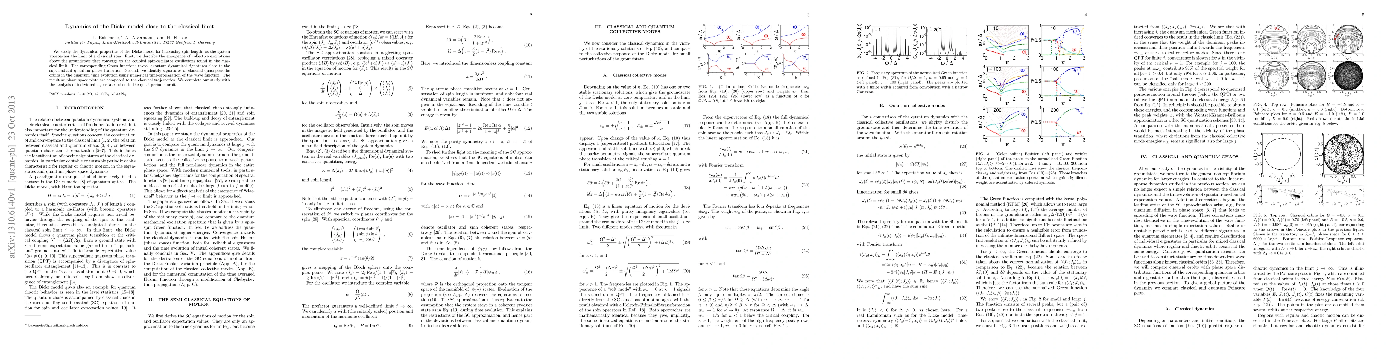 We study the dynamical properties of the Dicke model for increasing spin length, as the system approaches the limit of a classical spin. First, we describe the emergence of collective excitations above the groundstate that converge to the coupled spin-oscillator oscillations found in the classical limit. The corresponding Green functions reveal quantum dynamical signatures close to the superradiant quantum phase transition. Second, we identify signatures of classical quasi-periodic orbits in the quantum time evolution using numerical time-propagation of the wave function. The resulting phase space plots are compared to the classical trajectories. We complete our study with the analysis of individual eigenstates close to the quasi-periodic orbits.