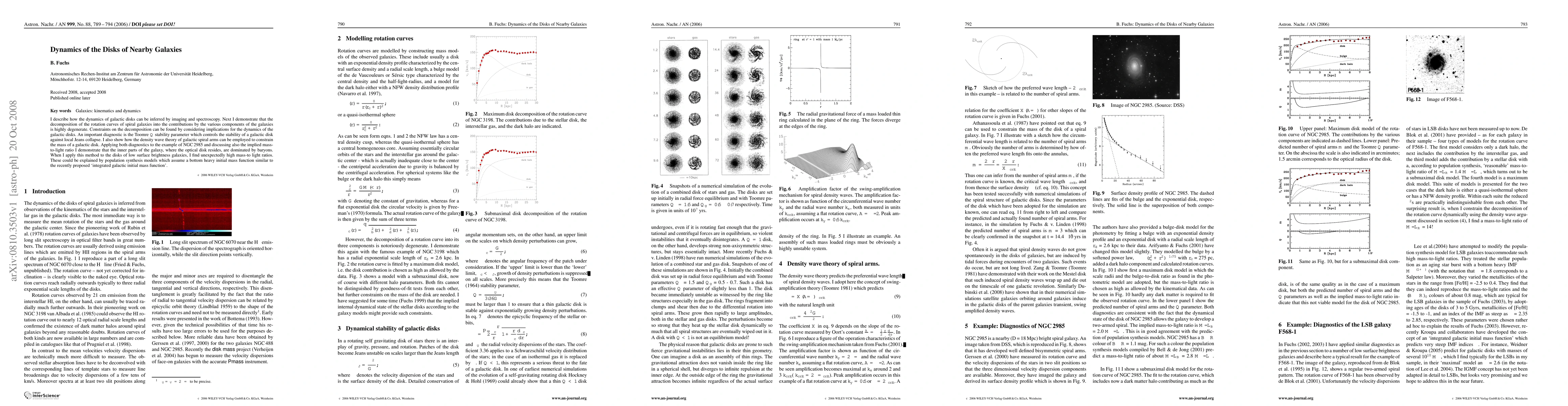 This paper explores the dynamics of nearby galactic disks using imaging and spectroscopy, highlighting the challenges in decomposing rotation curves into galactic components. It employs the Toomre Q stability parameter and density wave theory to infer the mass distribution, finding that low surface brightness galaxies have unexpectedly high mass-to-light ratios, potentially explained by a bottom-heavy initial mass function.