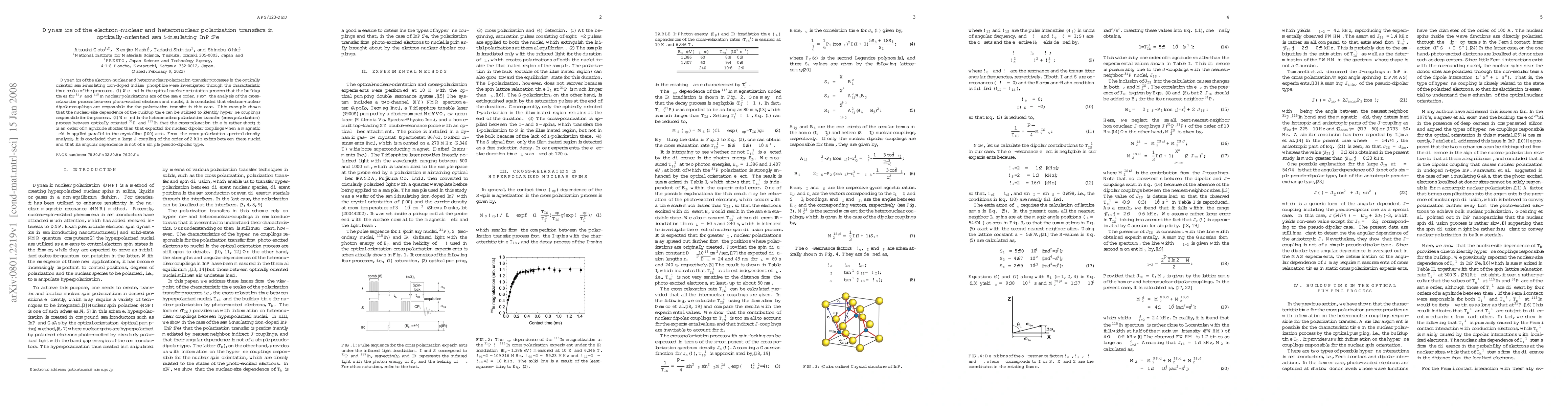 Dynamics of the electron-nuclear and heteronuclear polarization-transfer processes in the optically oriented semi-insulating iron-doped indium phosphide were investigated through the characteristic time scales of the processes. (1) We find in the optical nuclear orientation process that the buildup times for 31P and 115In nuclear polarizations are of the same order. From the analysis of the cross-relaxation process between photo-excited electrons and nuclei, it is concluded that electron-nuclear dipolar-couplings are responsible for the polarization transfer in this case. This example shows that the nuclear-site dependence of the buildup time can be utilized to identify hyperfine couplings responsible for the process. (2) We find in the heteronuclear polarization transfer (cross polarization) process between optically oriented 31P and 115In that the cross-relaxation time is rather short; it is an order of magnitude shorter than that expected for nuclear dipolar couplings when a magnetic field is applied parallel to the crystalline [100] axis. From the cross polarization spectral density analysis, it is concluded that a large J-coupling of the order of 2 kHz exists between these nuclei and that its angular dependence is not of a simple pseudo-dipolar type.