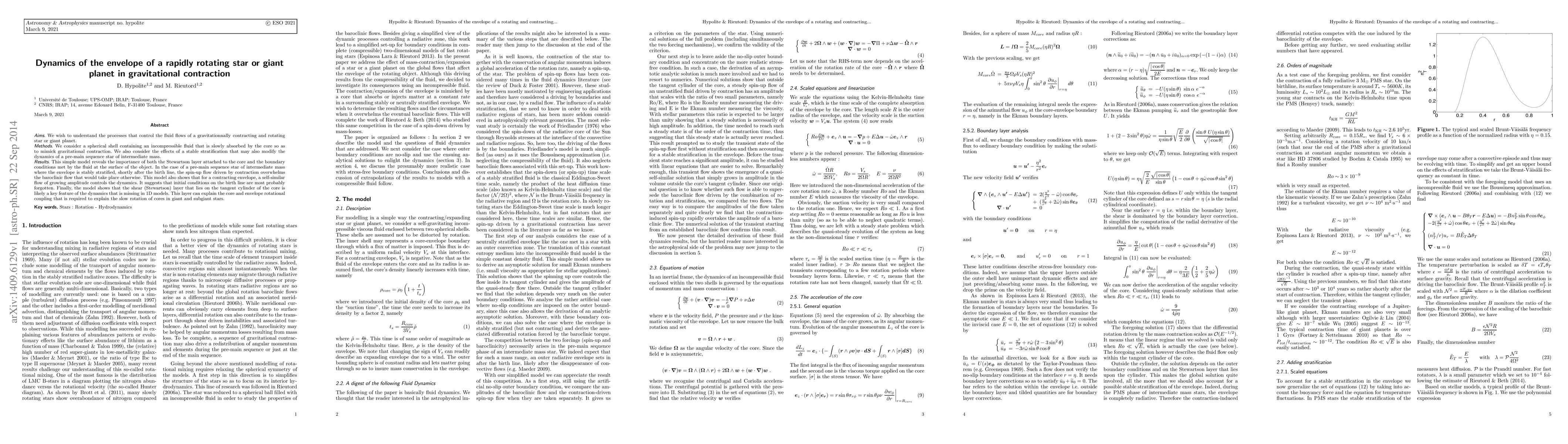 We wish to understand the processes that control the fluid flows of a gravitationally contracting and rotating star or giant planet. We consider a spherical shell containing an incompressible fluid that is slowly absorbed by the core so as to mimick gravitational contraction. We also consider the effects of a stable stratification that may also modify the dynamics of a pre-main sequence star of intermediate mass. This simple model reveals the importance of both the Stewartson layer attached to the core and the boundary conditions met by the fluid at the surface of the object. In the case of a pre-main sequence star of intermediate mass where the envelope is stably stratified, shortly after the birth line, the spin-up flow driven by contraction overwhelms the baroclinic flow that would take place otherwise.This model also shows that for a contracting envelope, a self-similar flow of growing amplitude controls the dynamics. It suggests that initial conditions on the birth line are most probably forgotten. Finally, the model shows that the near (Stewartson) layer that lies on the tangent cylinder of the core is likely a key feature of the dynamics that is missing in 1D models.This layer can explain the core and envelope rotational coupling that is required to explain the slow rotation of cores in giant and subgiants stars.