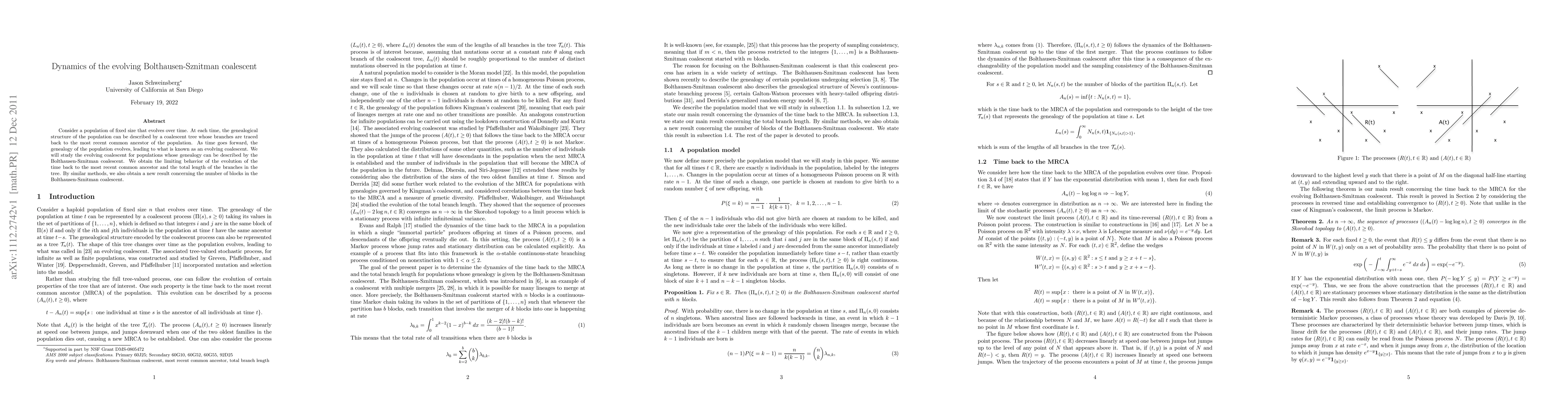 This paper investigates the dynamics of the evolving Bolthausen-Sznitman coalescent, focusing on the genealogical structure of a fixed-size population over time. It determines the limiting behavior of the time back to the most recent common ancestor and the total branch length in the coalescent tree, along with a new result on the number of blocks in the coalescent.