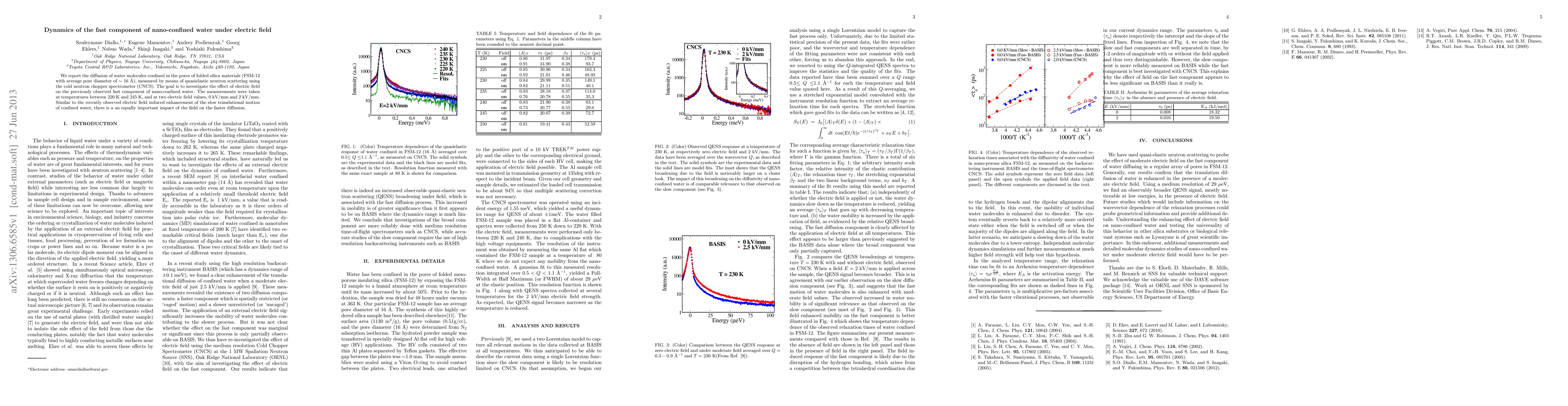 We report the diffusion of water molecules confined in the pores of folded silica materials (FSM-12 with average pore diameter of $\sim$ 16 \AA), measured by means of quasielastic neutron scattering using the cold neutron chopper spectrometer (CNCS). The goal is to investigate the effect of electric field on the previously observed fast component of nano-confined water. The measurements were taken at temperatures between 220 K and 245 K, and at two electric field values, 0 kV/mm and 2 kV/mm. Similar to the recently observed electric field induced enhancement of the slow translational motion of confined water, there is a an equally important impact of the field on the faster diffusion.